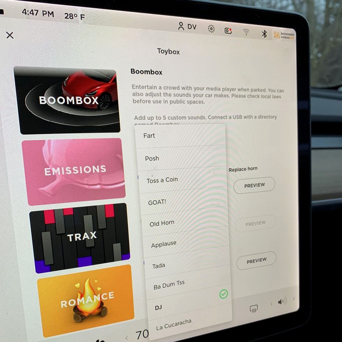 Под Новый год электромобили Tesla получили обновление для информационной системы. Патч добавил машине режим Boombox: теперь она может воспроизводить несколько звуков и мелодий с помощью специального динамика.