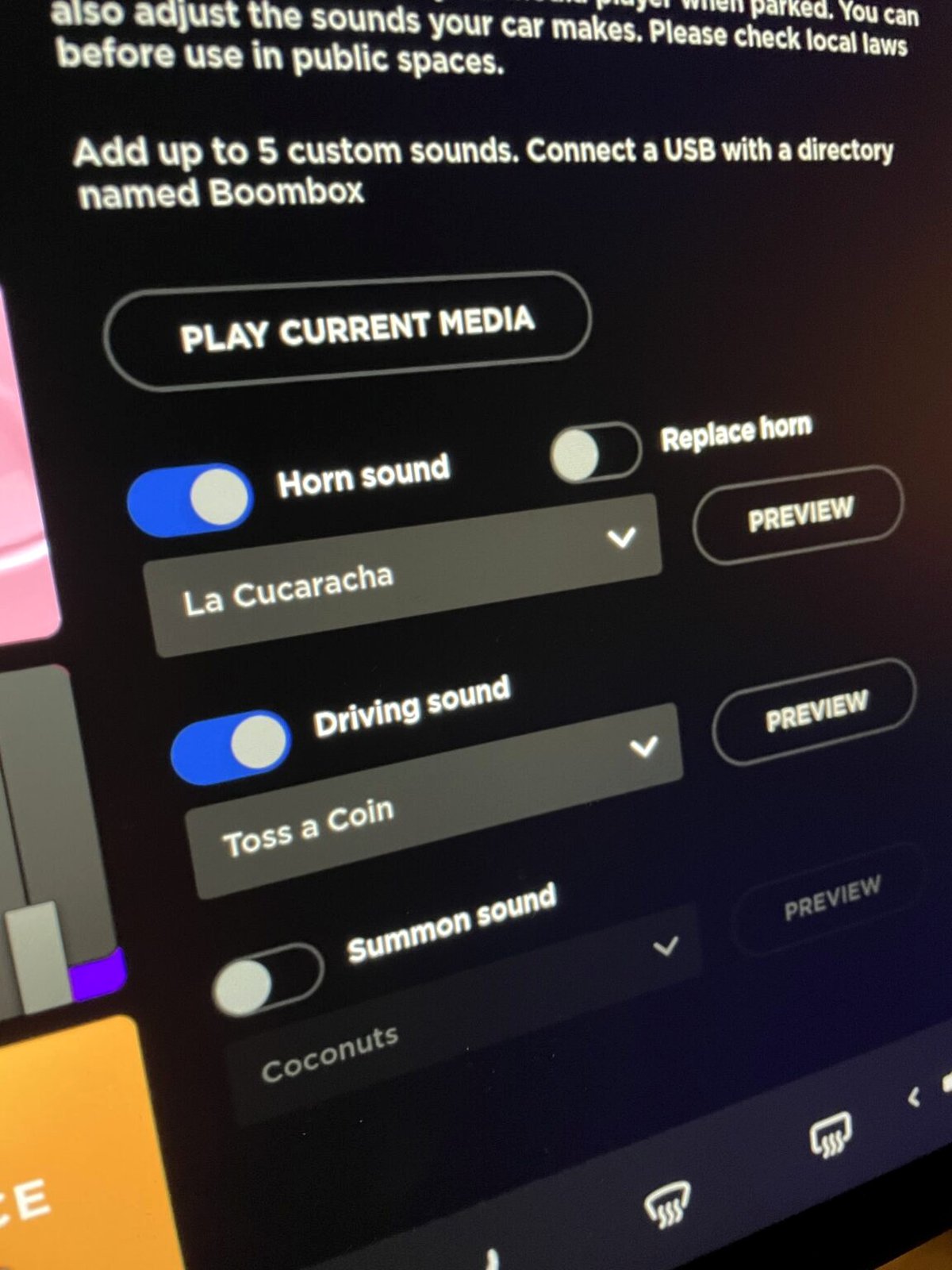 А вот так выглядит полный список звуков и мелодий, которые может исполнять электромобиль. Помимо песни про ведьмака и монету здесь есть La Cucaracha, Ba Dum Tss, аплодисменты — и, хм, звуки испускания воздуха.