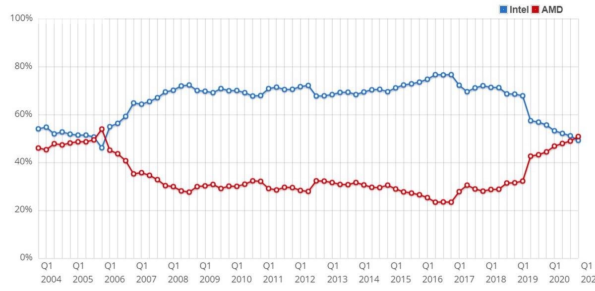 Ситуация на рынке десктопных процессоров началам меняться в начале 2017 года, когда AMD выпустила первые процессоры на базе архитектуры Zen. Резкие падения доли Intel на графике довольно точно соответствуют выпуску новых моделей процессоров AMD.