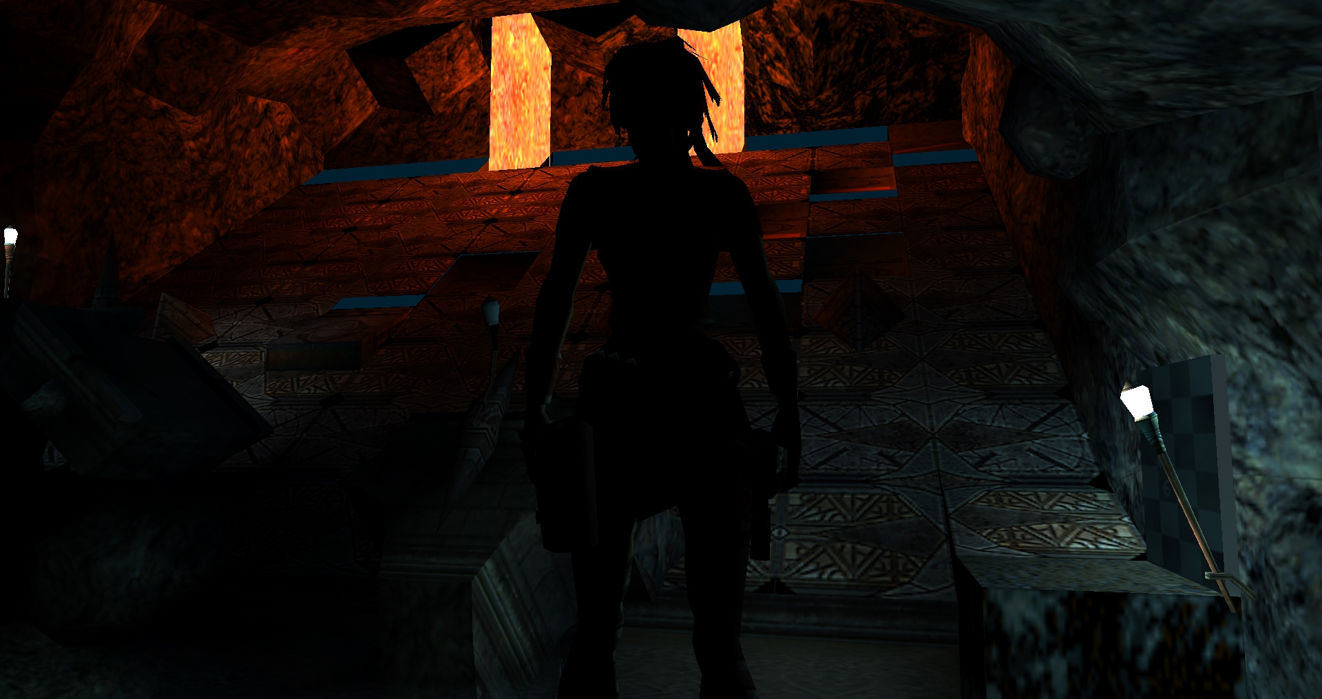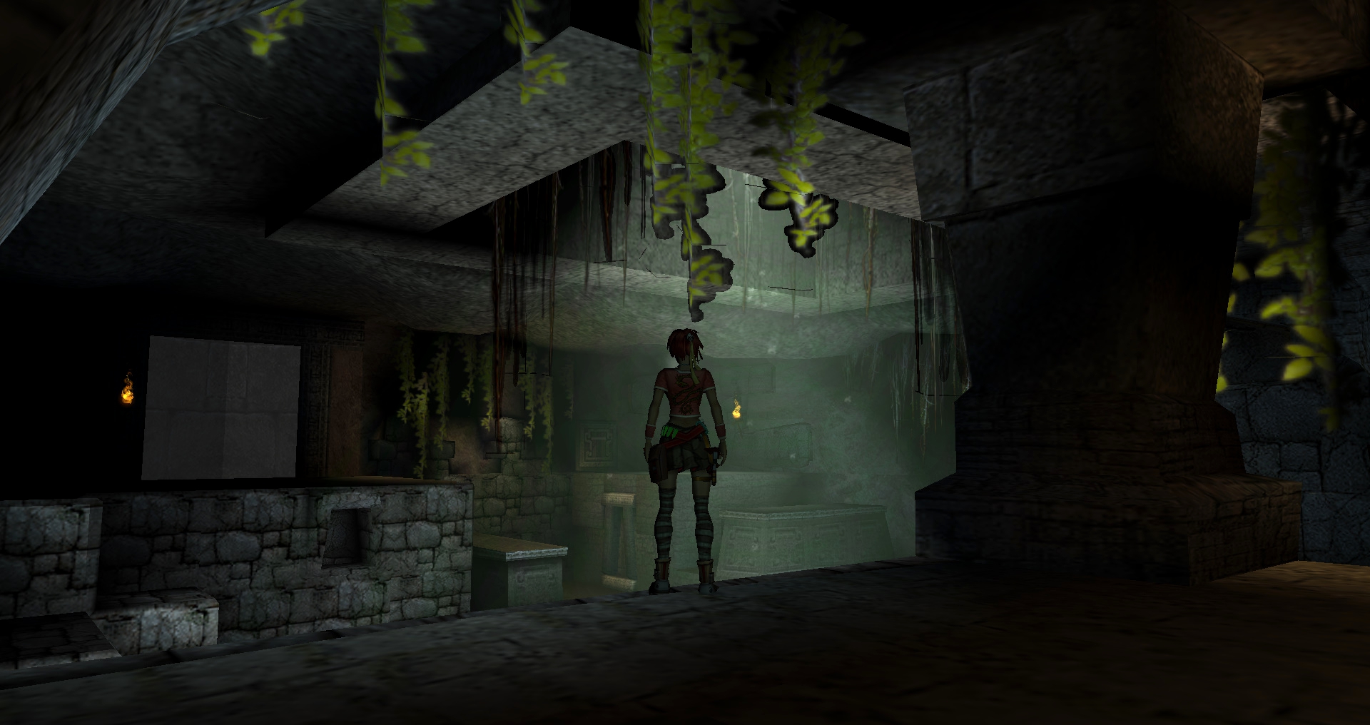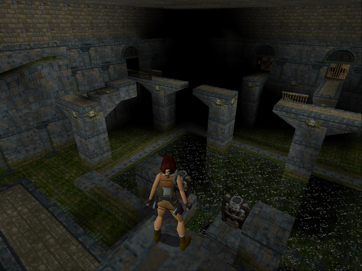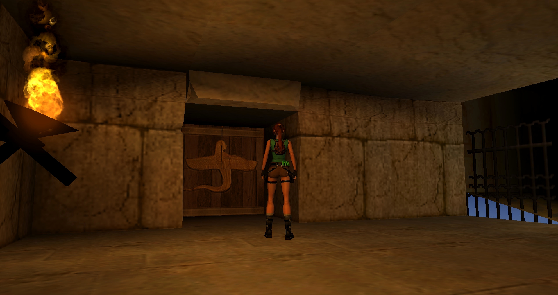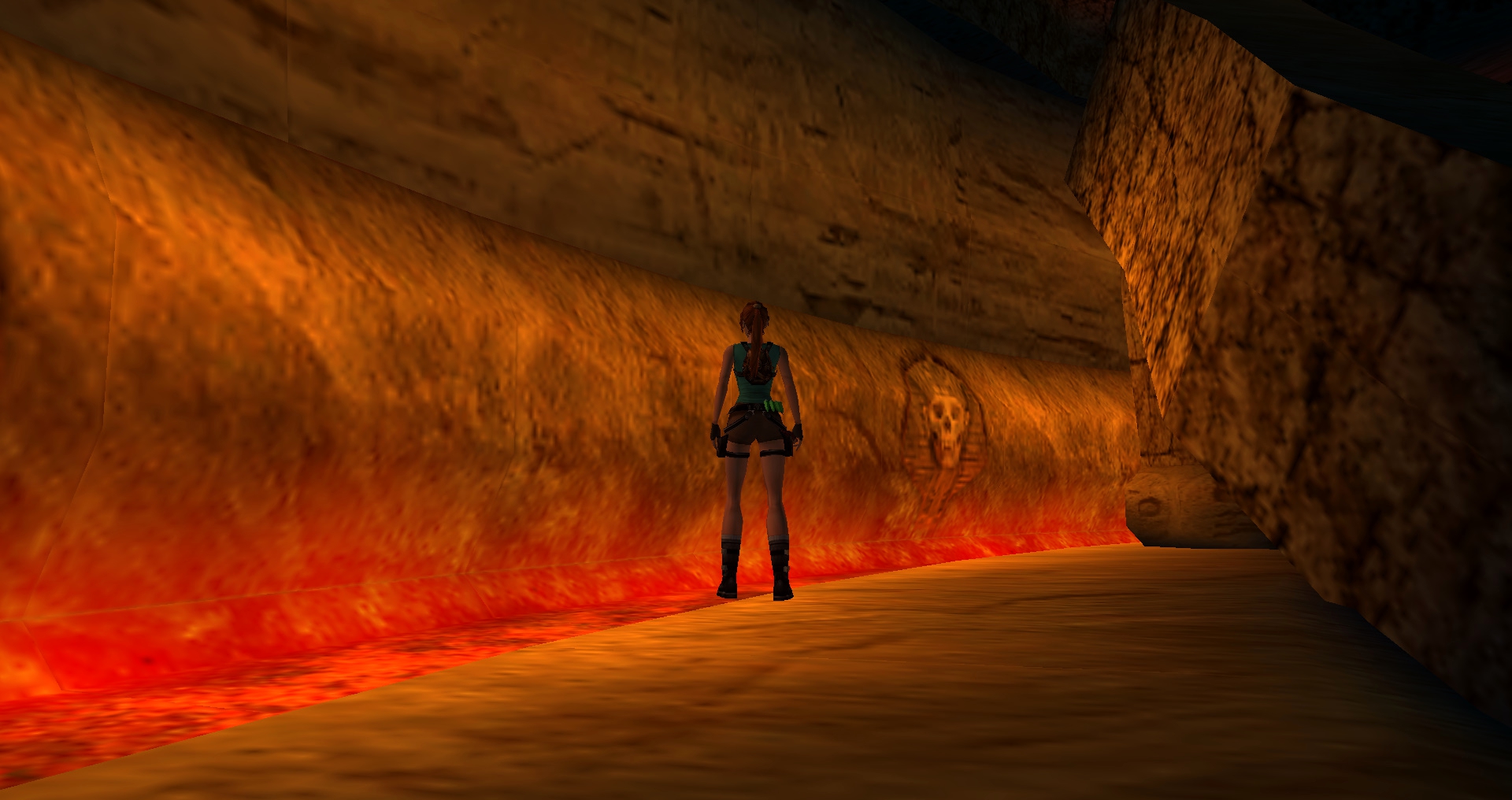 Вообще, уровень вобрал в себя две эпохи, отчего начинаешь игру с переделанной локации, а где-то к середине попадаешь в привычный 1996 год. Разумеется, до финала тут как до луны, враги стоят столбом, белые все, кроме крокодилов, которые, как оказалось, всё-таки могут плавать (хотя это может быть реставрацией фанатов, ибо уровень не запускался без вмешательства). Двери к испытаниям стоят без текстур, но коды к ним те же самые, что в оригинале, но зайдя к ним – ничего не работает. Колона не обрушает локацию, а огня и вовсе нет, тем не менее я не жалуюсь на такую недоработку, всё-таки огненное испытание поджигало не только Лару...