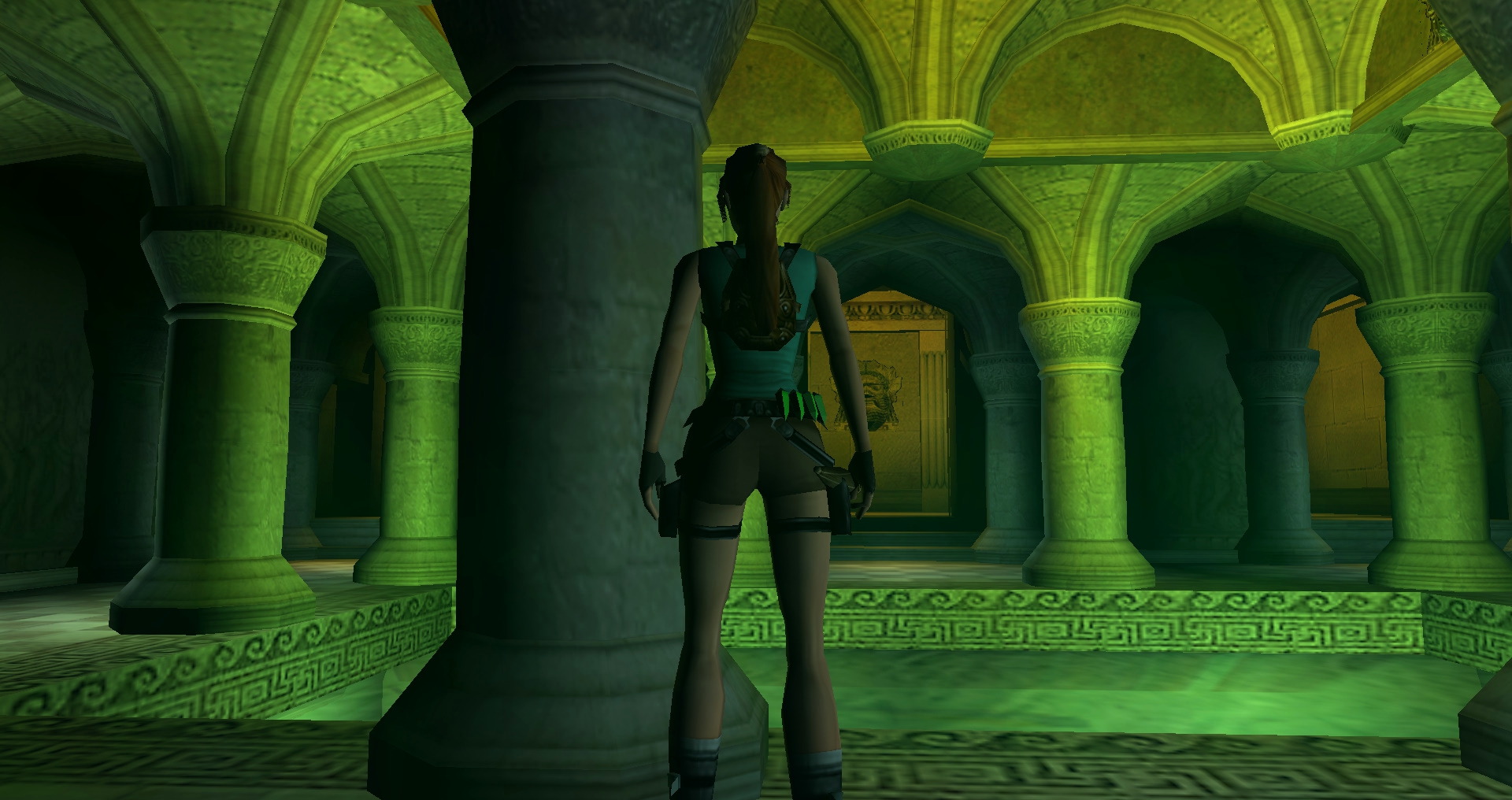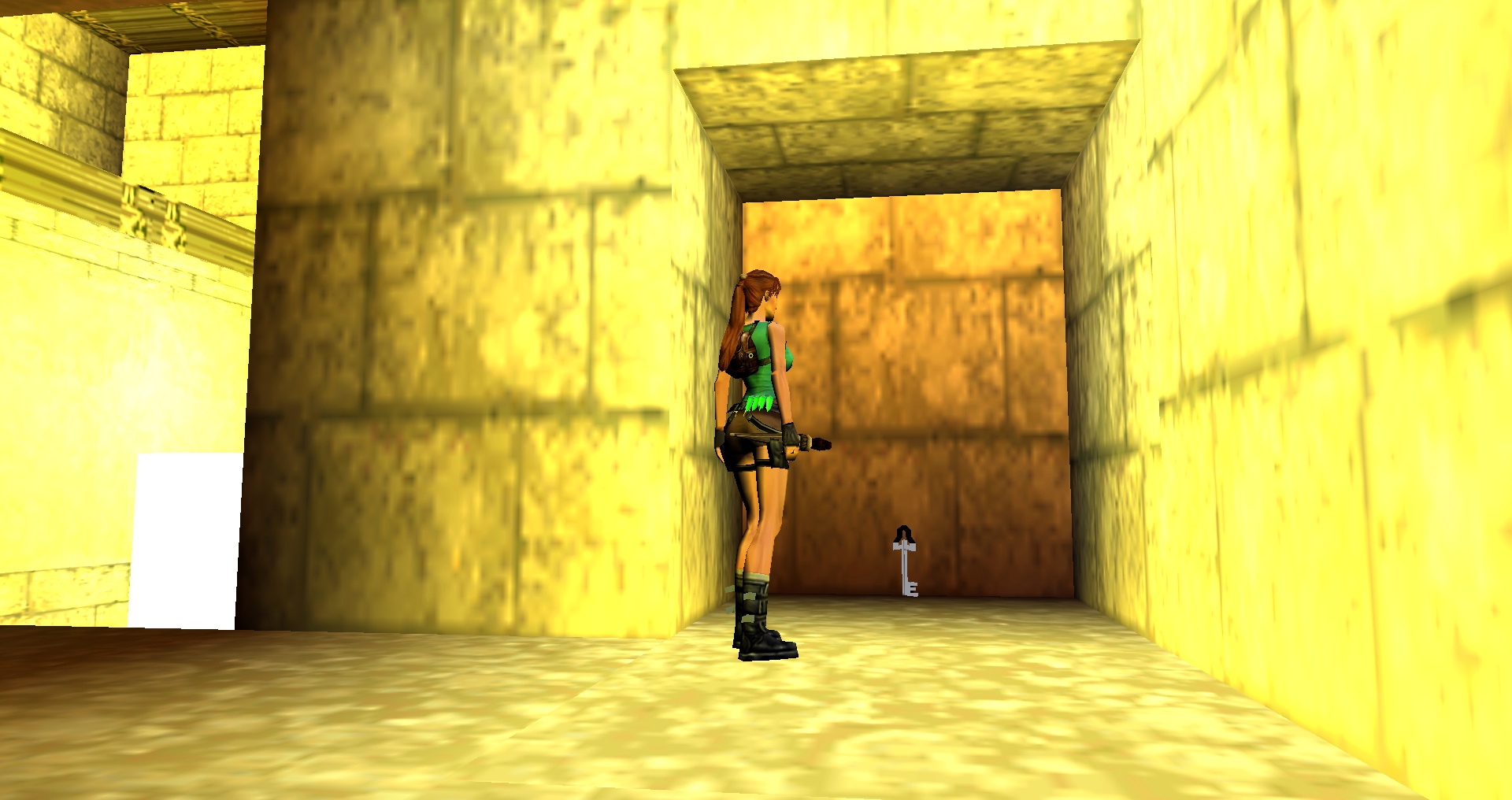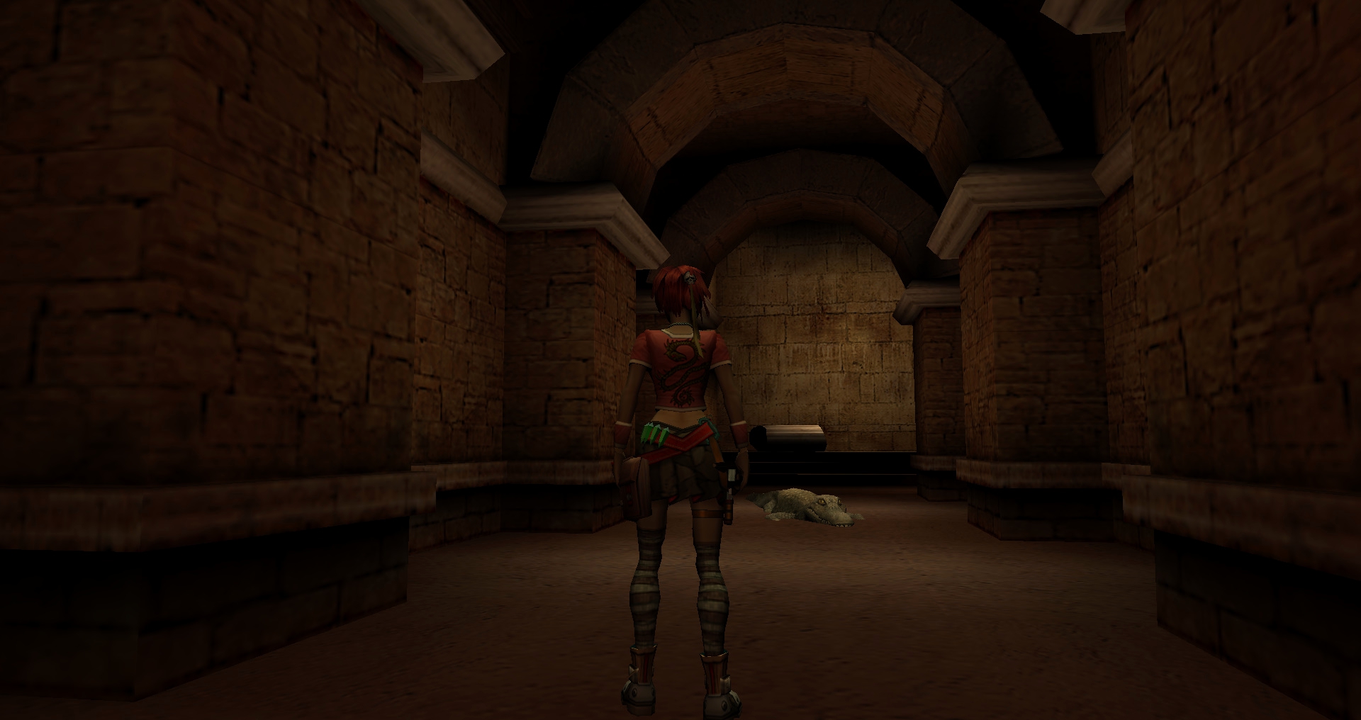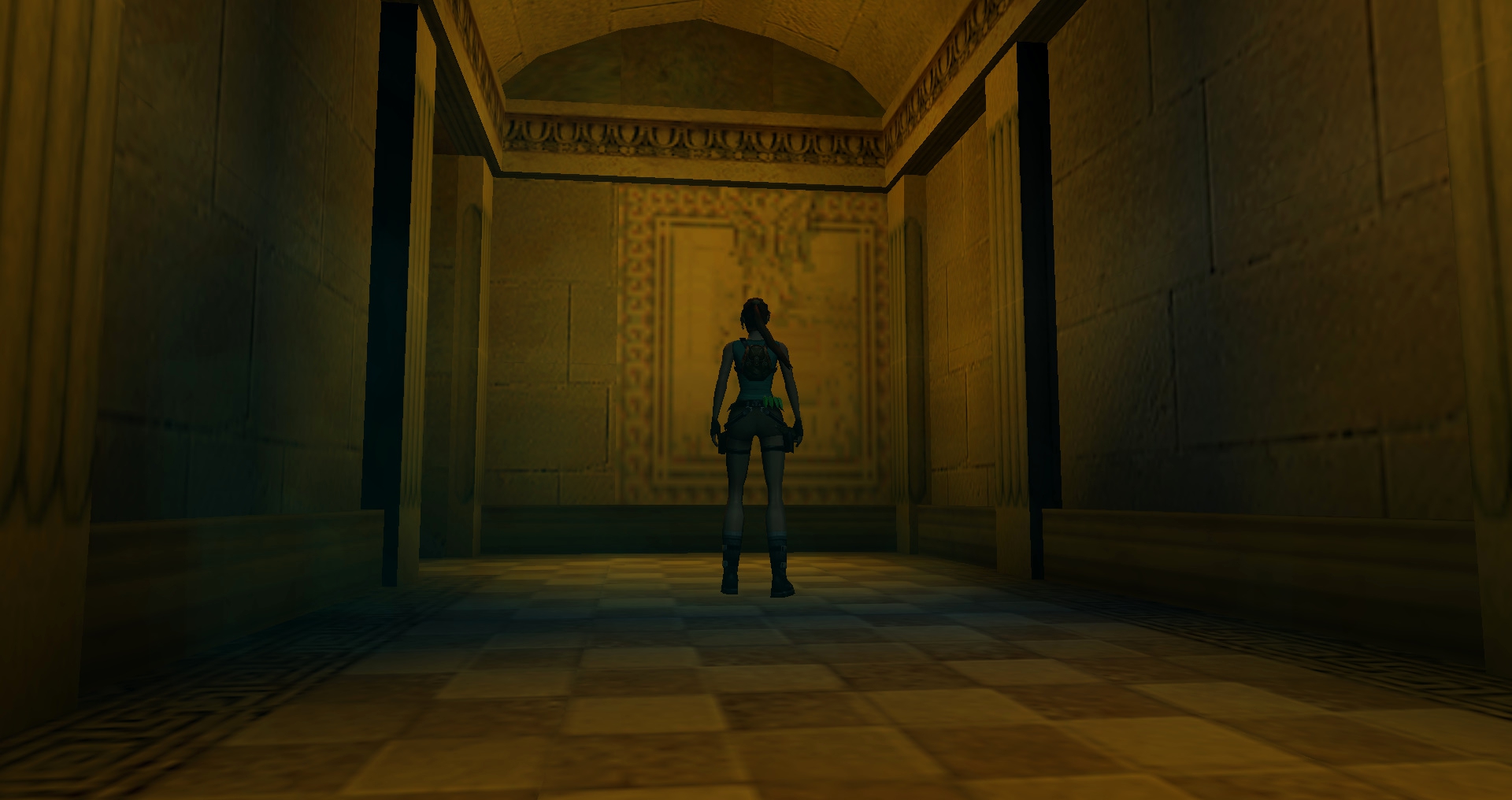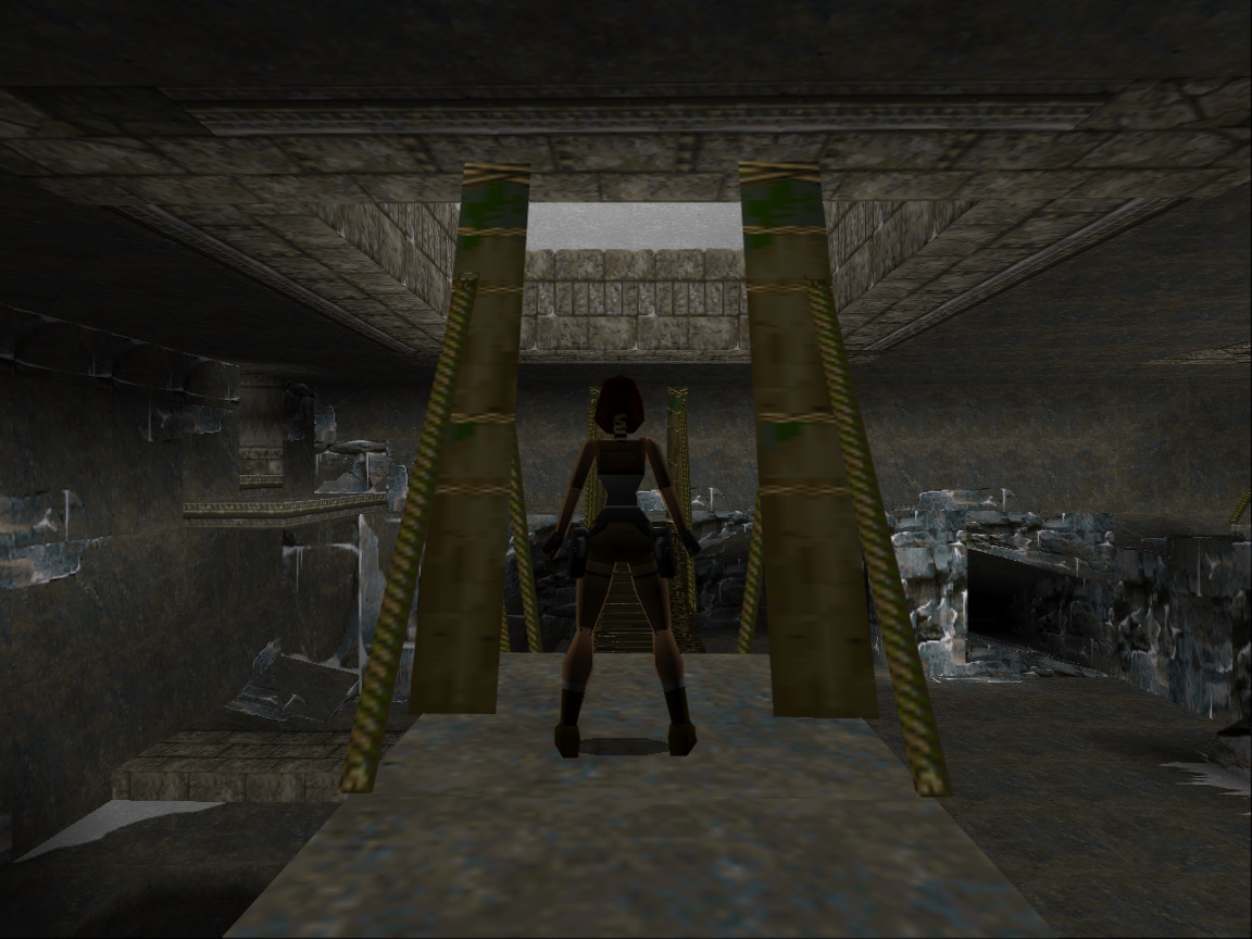 Вообще, уровень вобрал в себя две эпохи, отчего начинаешь игру с переделанной локации, а где-то к середине попадаешь в привычный 1996 год. Разумеется, до финала тут как до луны, враги стоят столбом, белые все, кроме крокодилов, которые, как оказалось, всё-таки могут плавать (хотя это может быть реставрацией фанатов, ибо уровень не запускался без вмешательства). Двери к испытаниям стоят без текстур, но коды к ним те же самые, что в оригинале, но зайдя к ним – ничего не работает. Колона не обрушает локацию, а огня и вовсе нет, тем не менее я не жалуюсь на такую недоработку, всё-таки огненное испытание поджигало не только Лару...