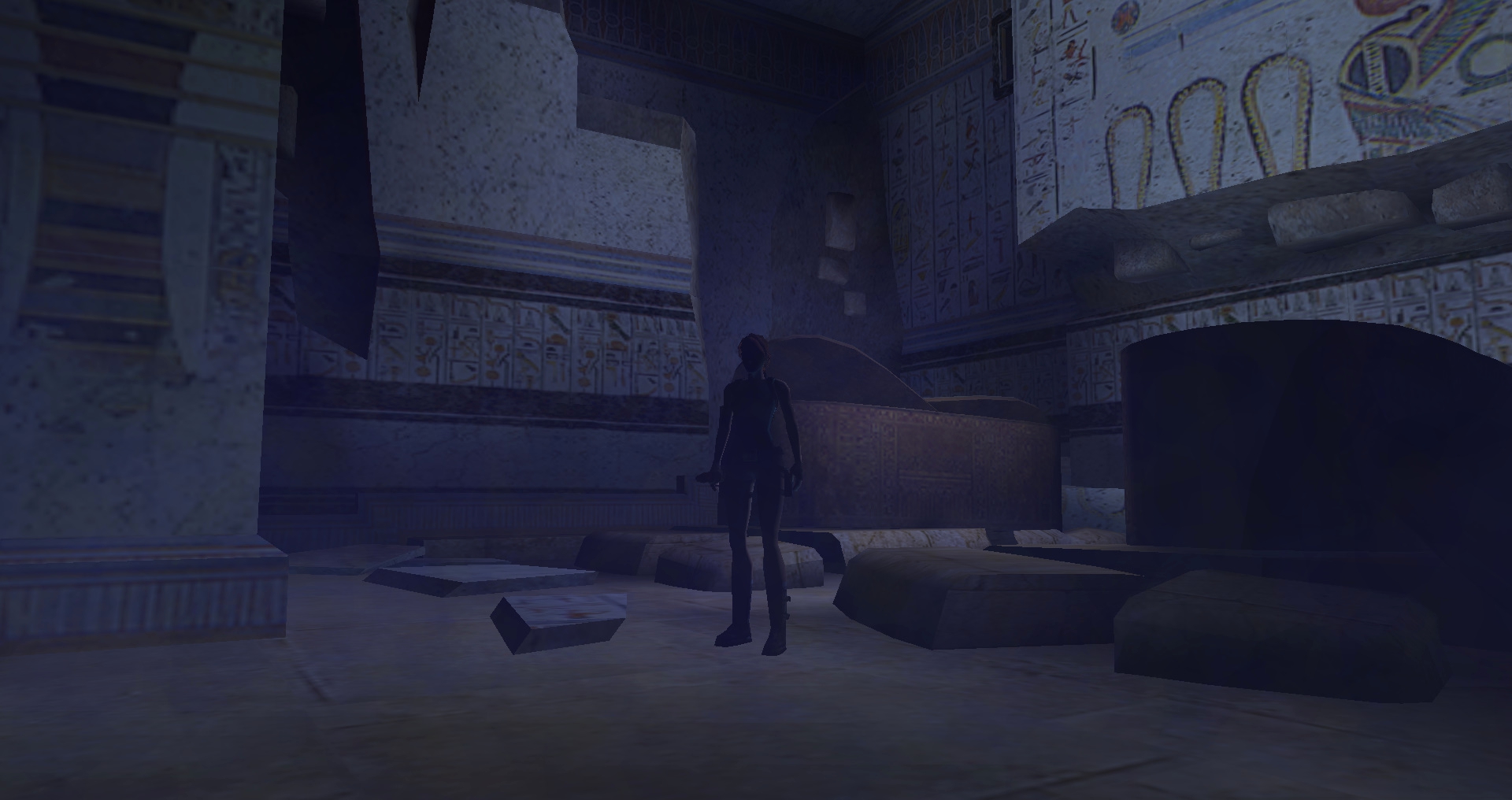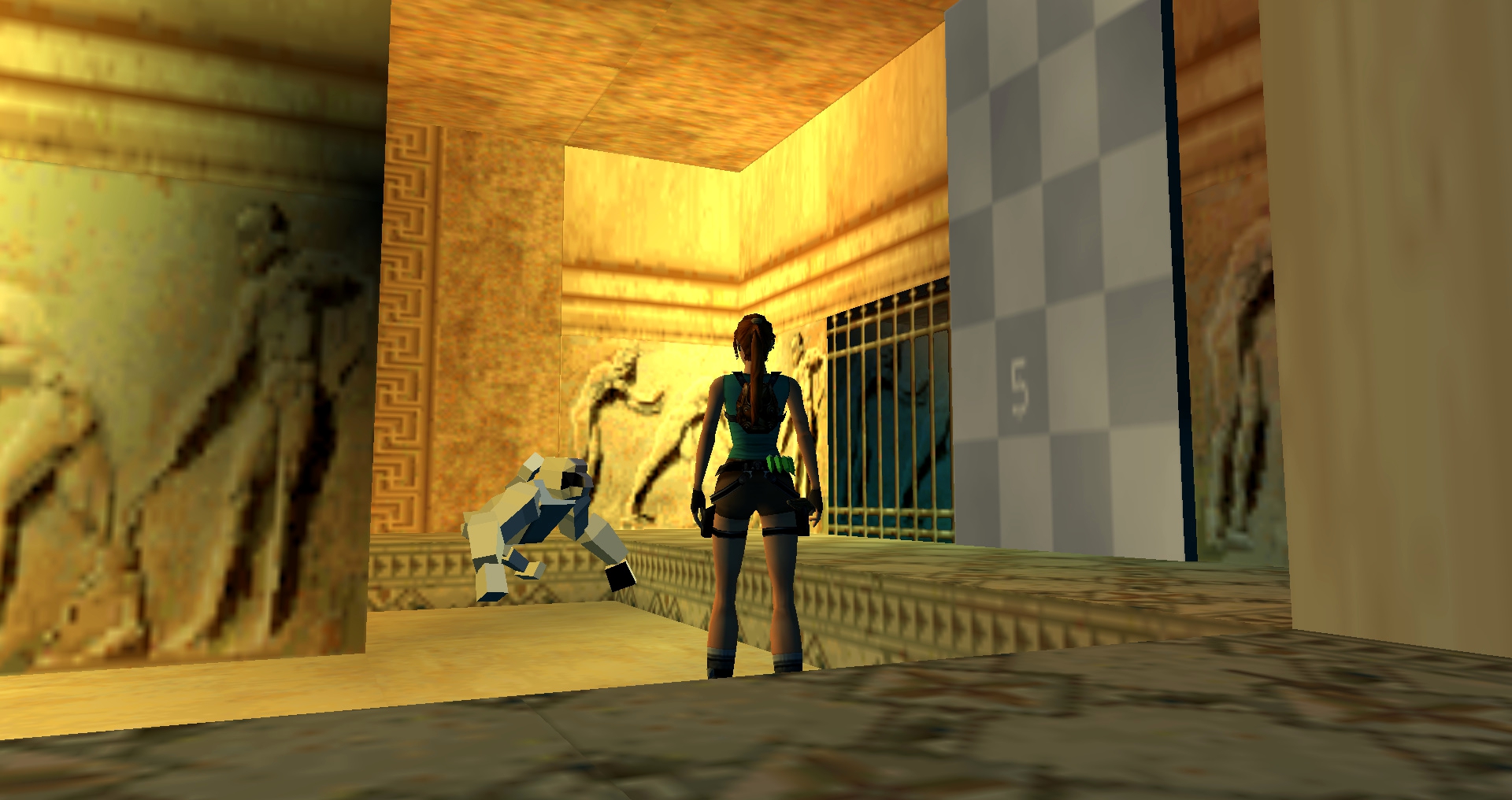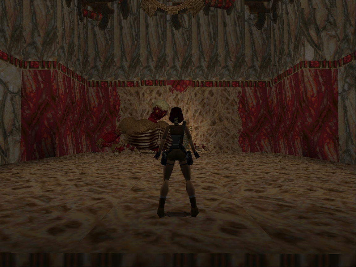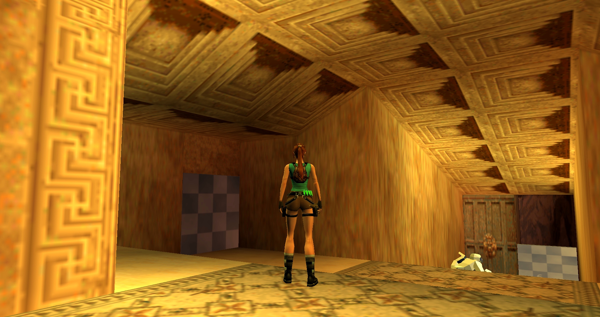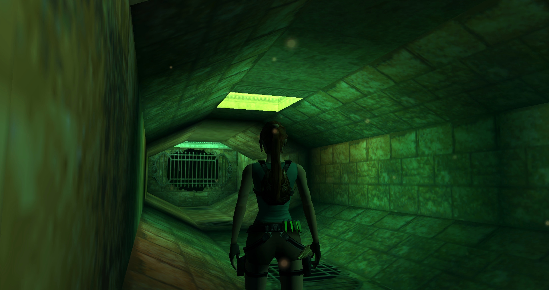 Вообще, уровень вобрал в себя две эпохи, отчего начинаешь игру с переделанной локации, а где-то к середине попадаешь в привычный 1996 год. Разумеется, до финала тут как до луны, враги стоят столбом, белые все, кроме крокодилов, которые, как оказалось, всё-таки могут плавать (хотя это может быть реставрацией фанатов, ибо уровень не запускался без вмешательства). Двери к испытаниям стоят без текстур, но коды к ним те же самые, что в оригинале, но зайдя к ним – ничего не работает. Колона не обрушает локацию, а огня и вовсе нет, тем не менее я не жалуюсь на такую недоработку, всё-таки огненное испытание поджигало не только Лару...