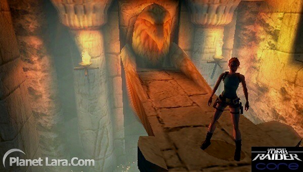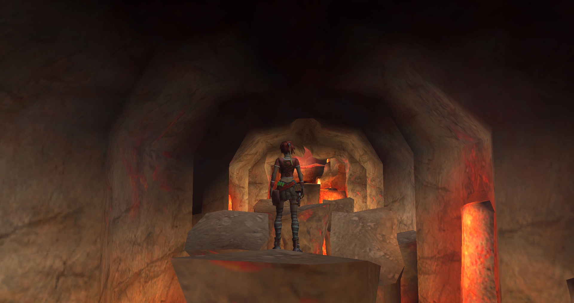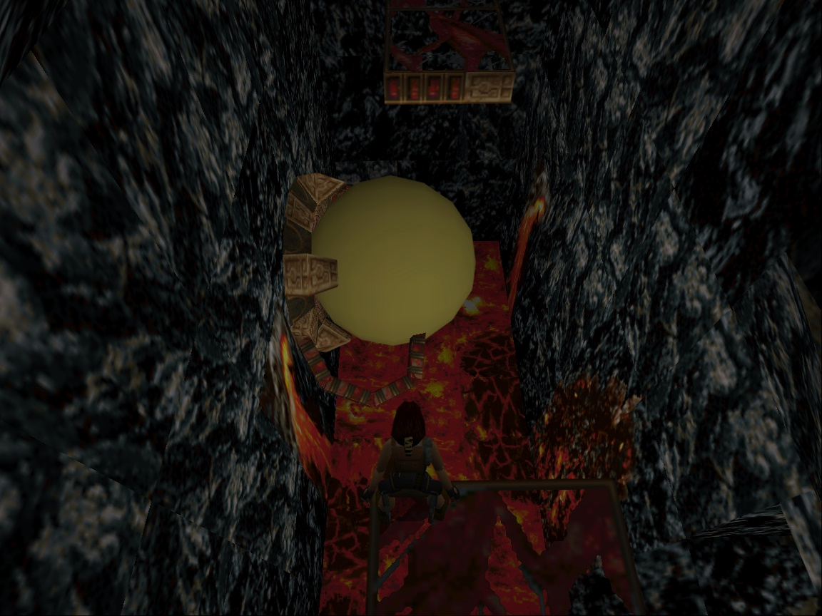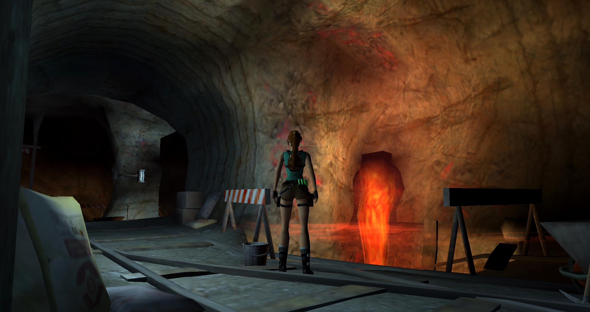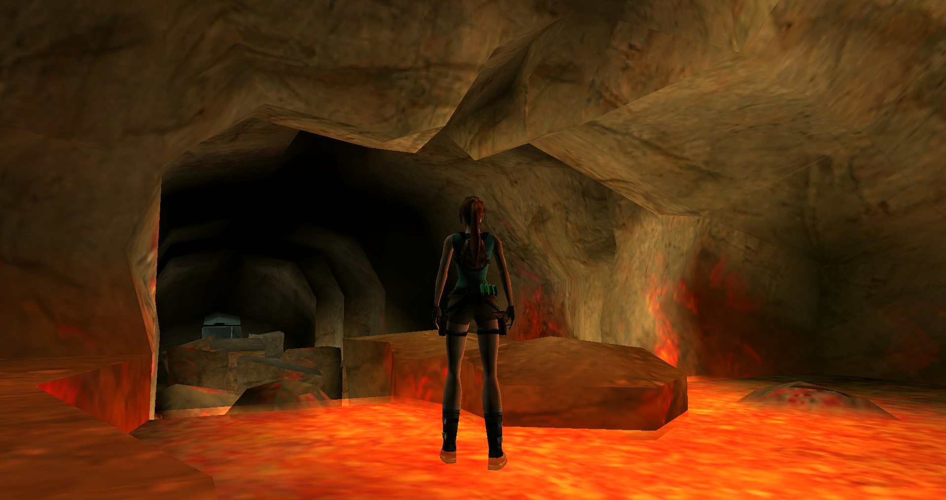 Снова враги тут помечены как ящики TNT, а ключи – деревянные шестерни. Лавовые участки имеют столбы, что появились в ремейке 2007 года, но Лара на них запрыгнуть не может.