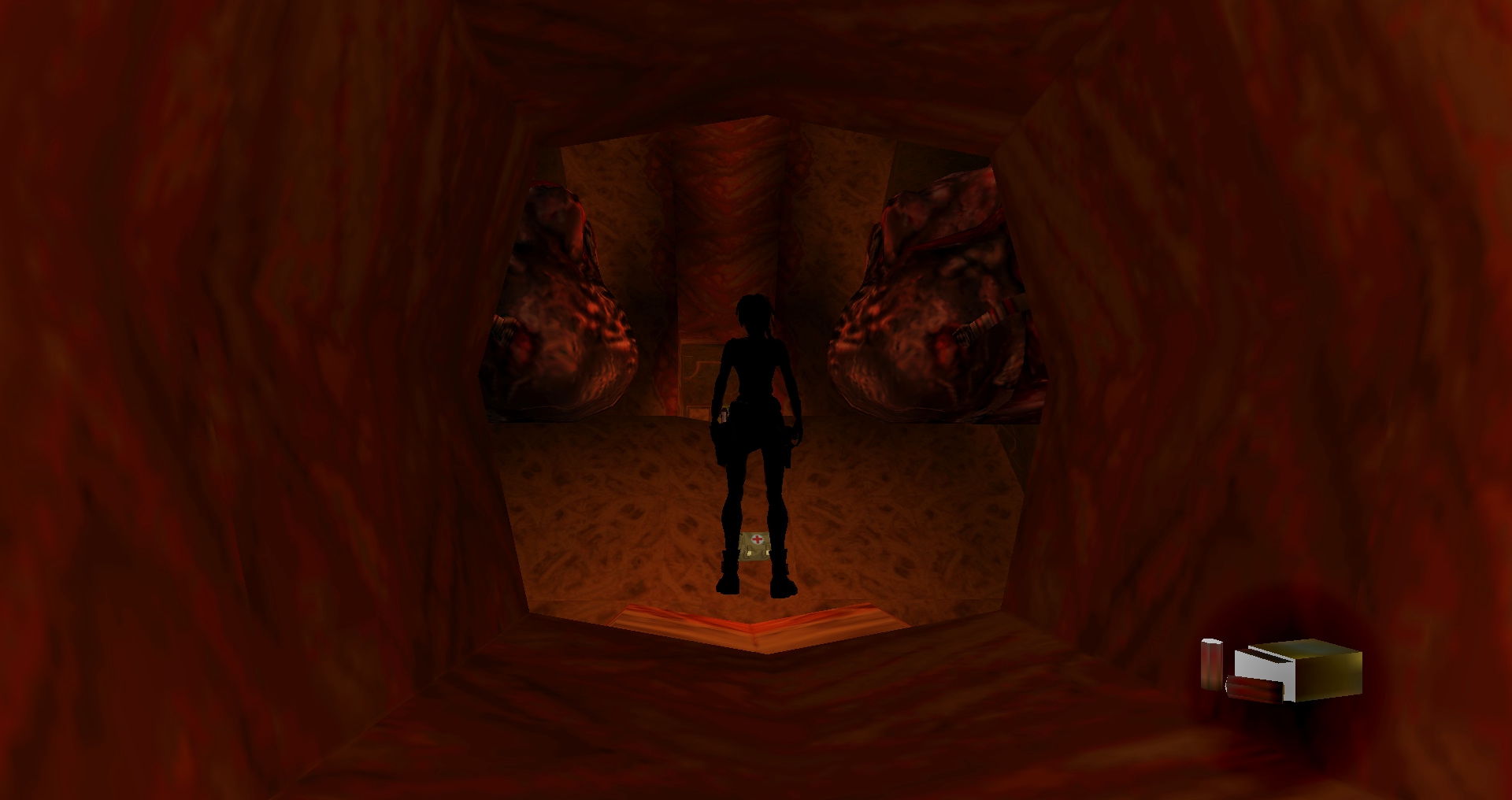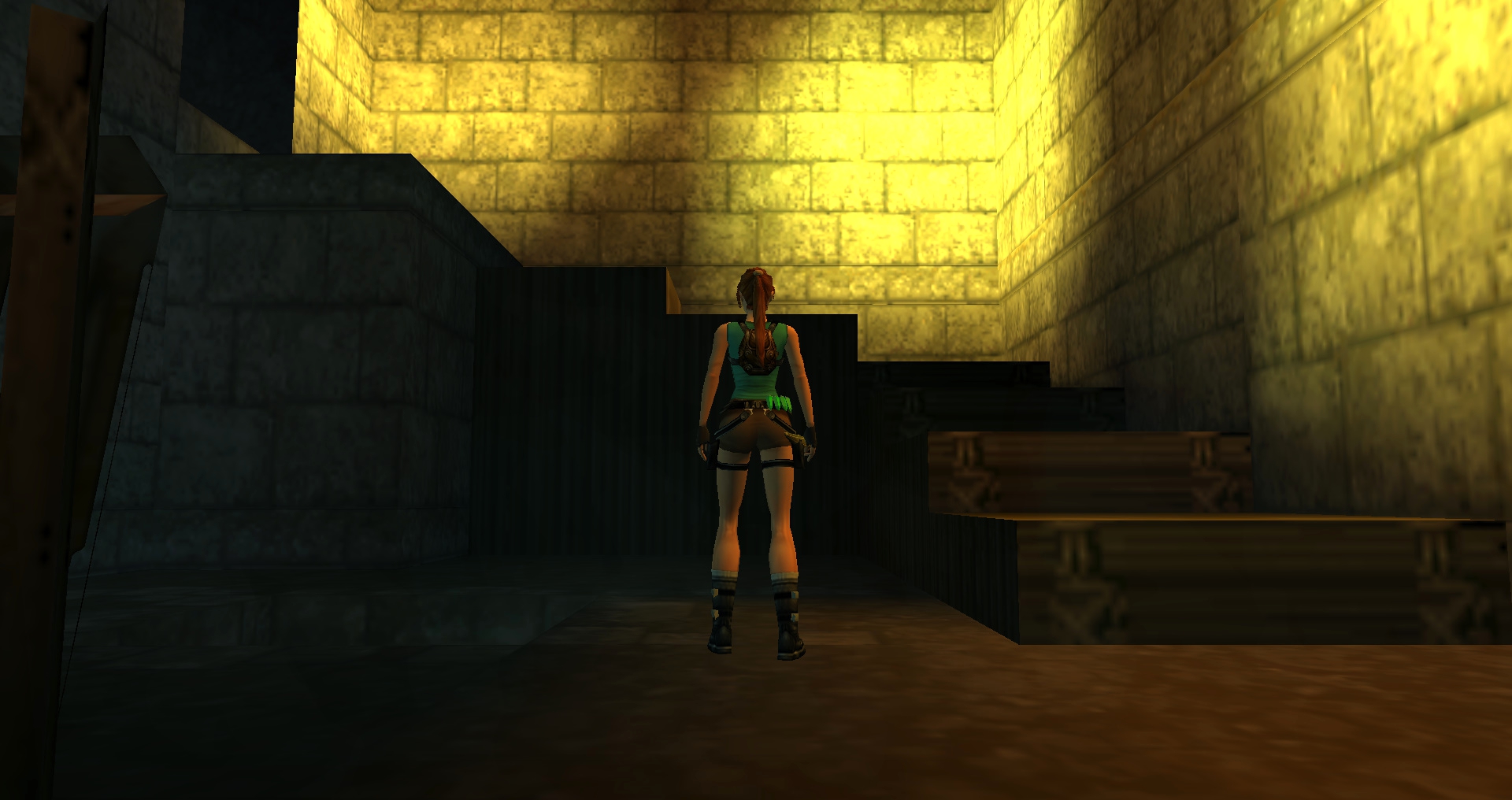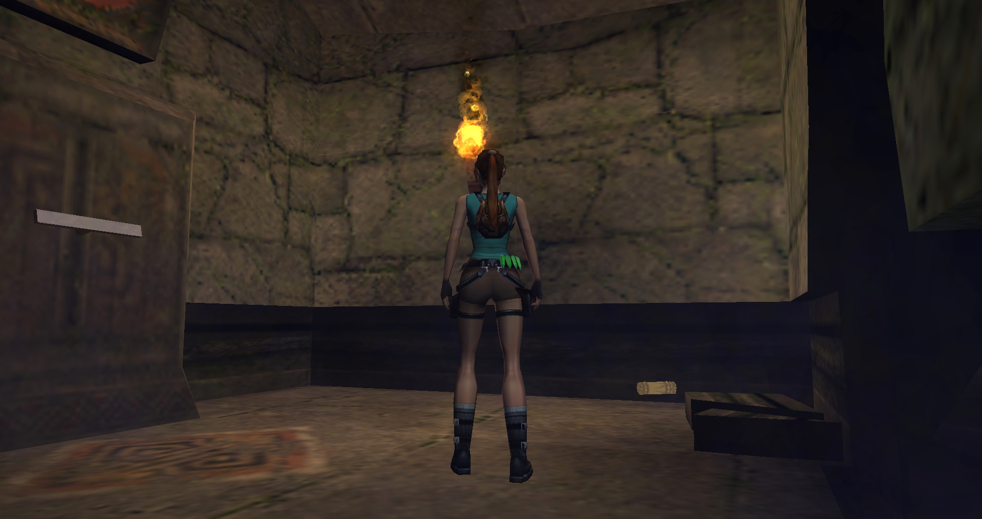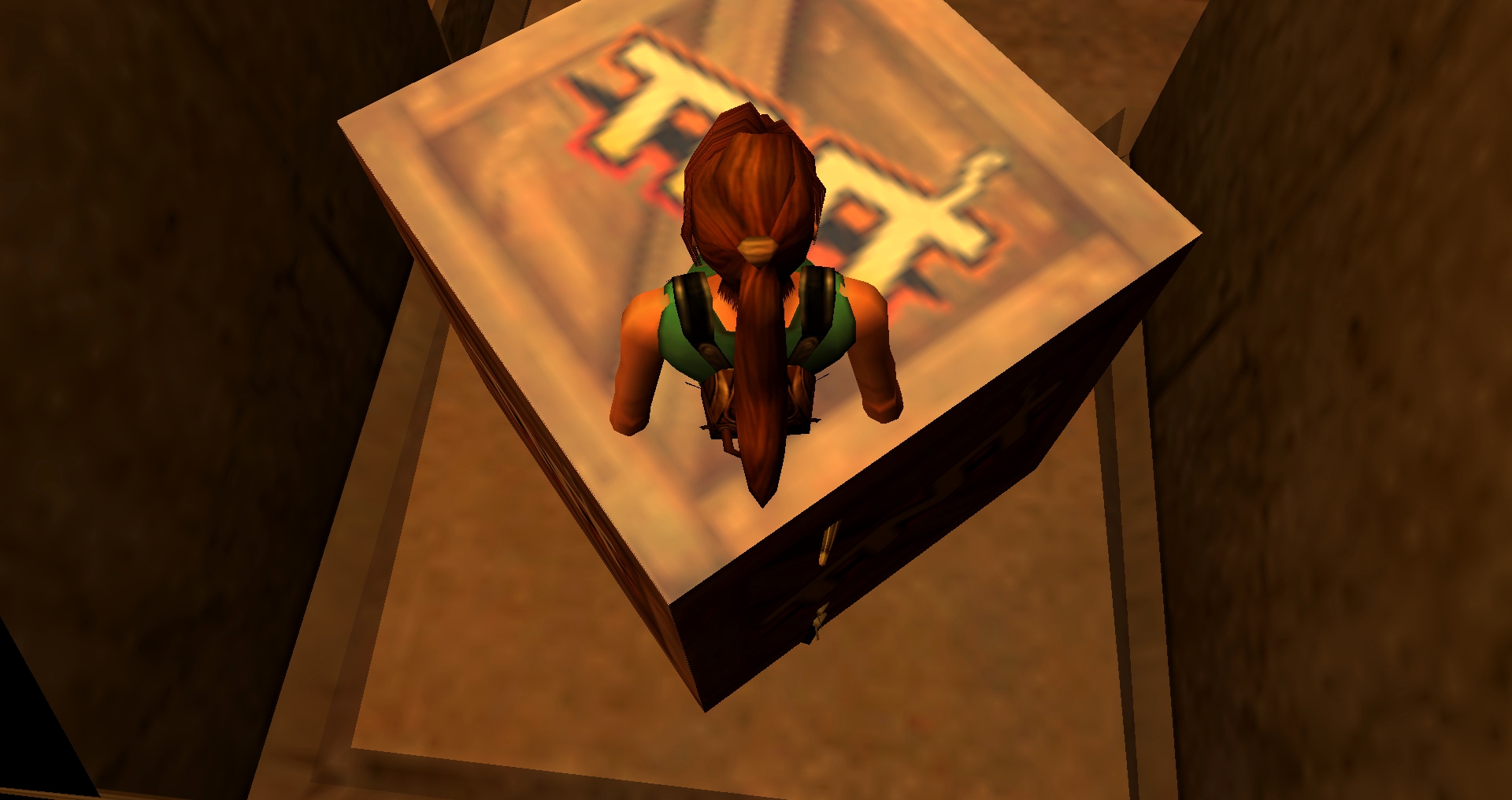 Снова враги тут помечены как ящики TNT, а ключи – деревянные шестерни. Лавовые участки имеют столбы, что появились в ремейке 2007 года, но Лара на них запрыгнуть не может.