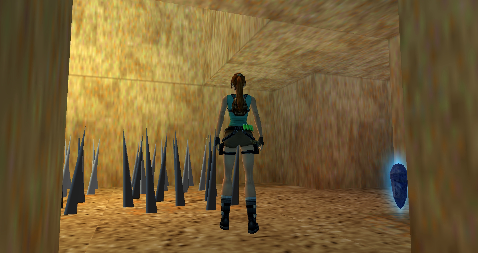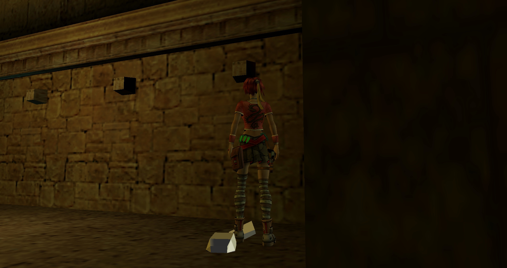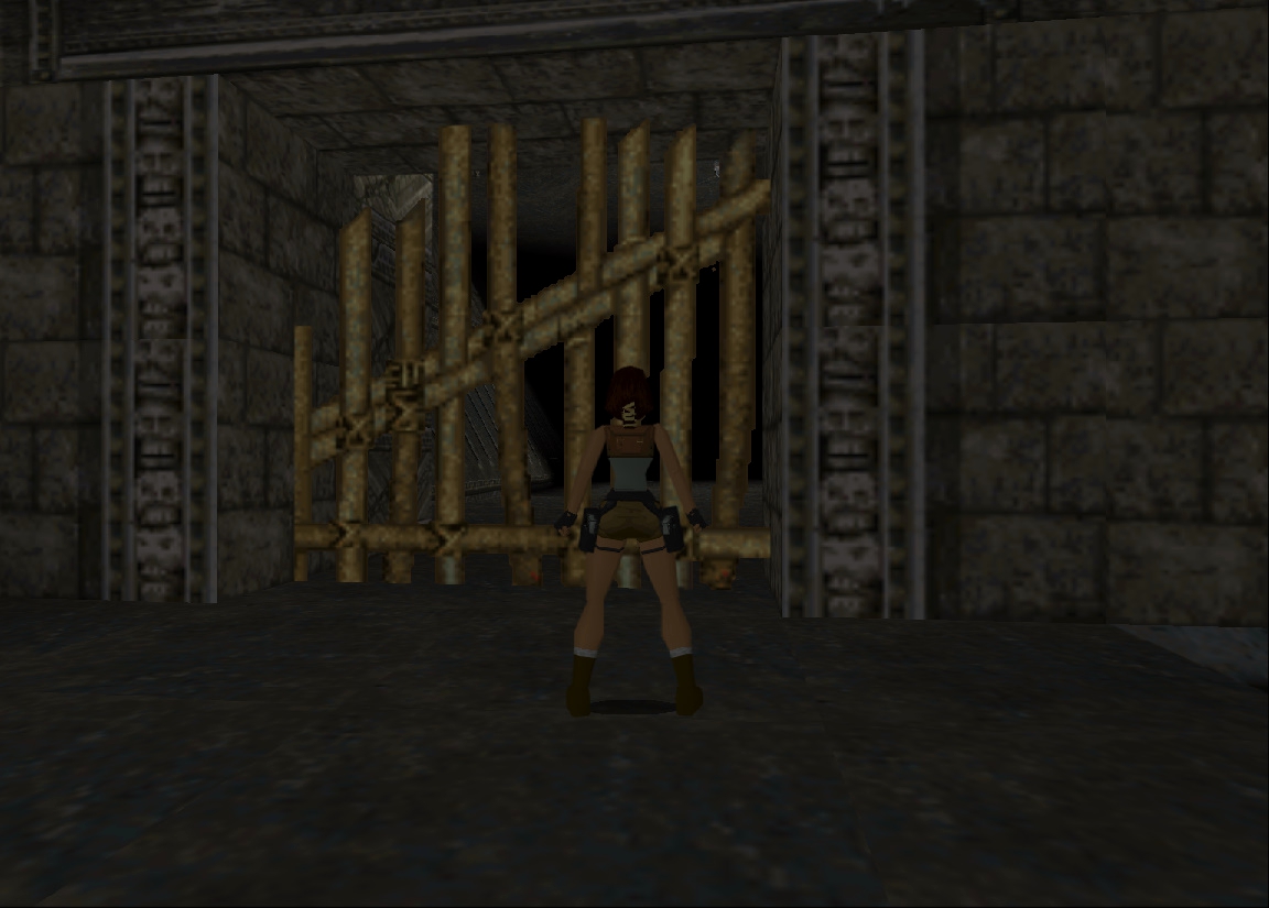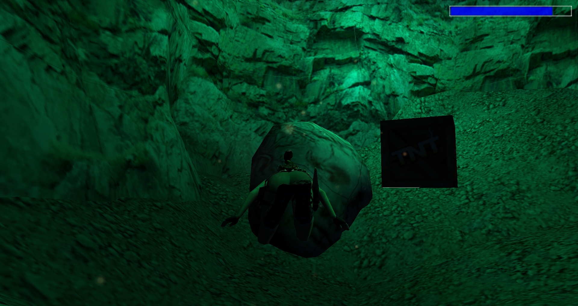 Снова враги тут помечены как ящики TNT, а ключи – деревянные шестерни. Лавовые участки имеют столбы, что появились в ремейке 2007 года, но Лара на них запрыгнуть не может.