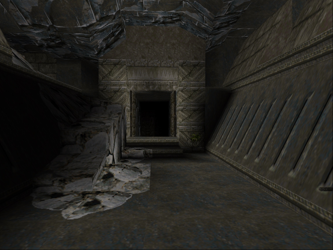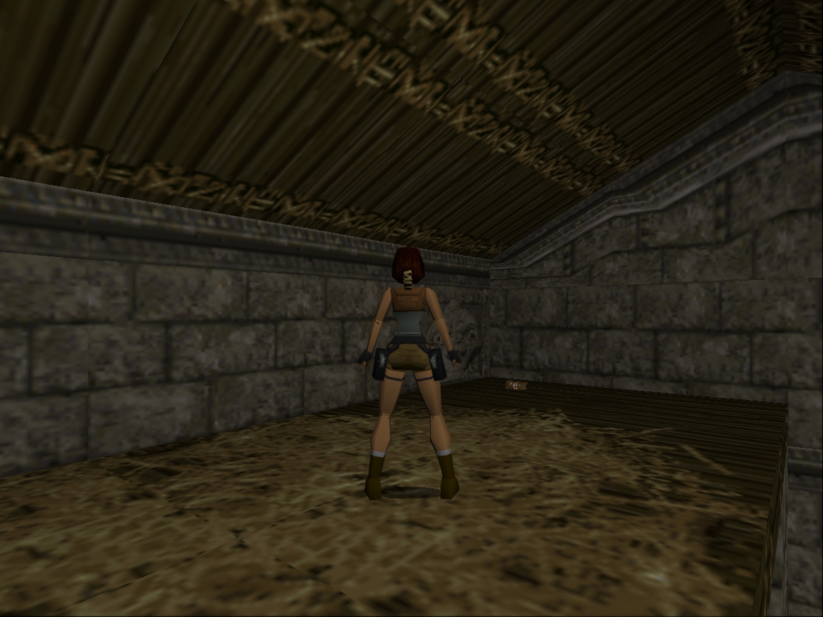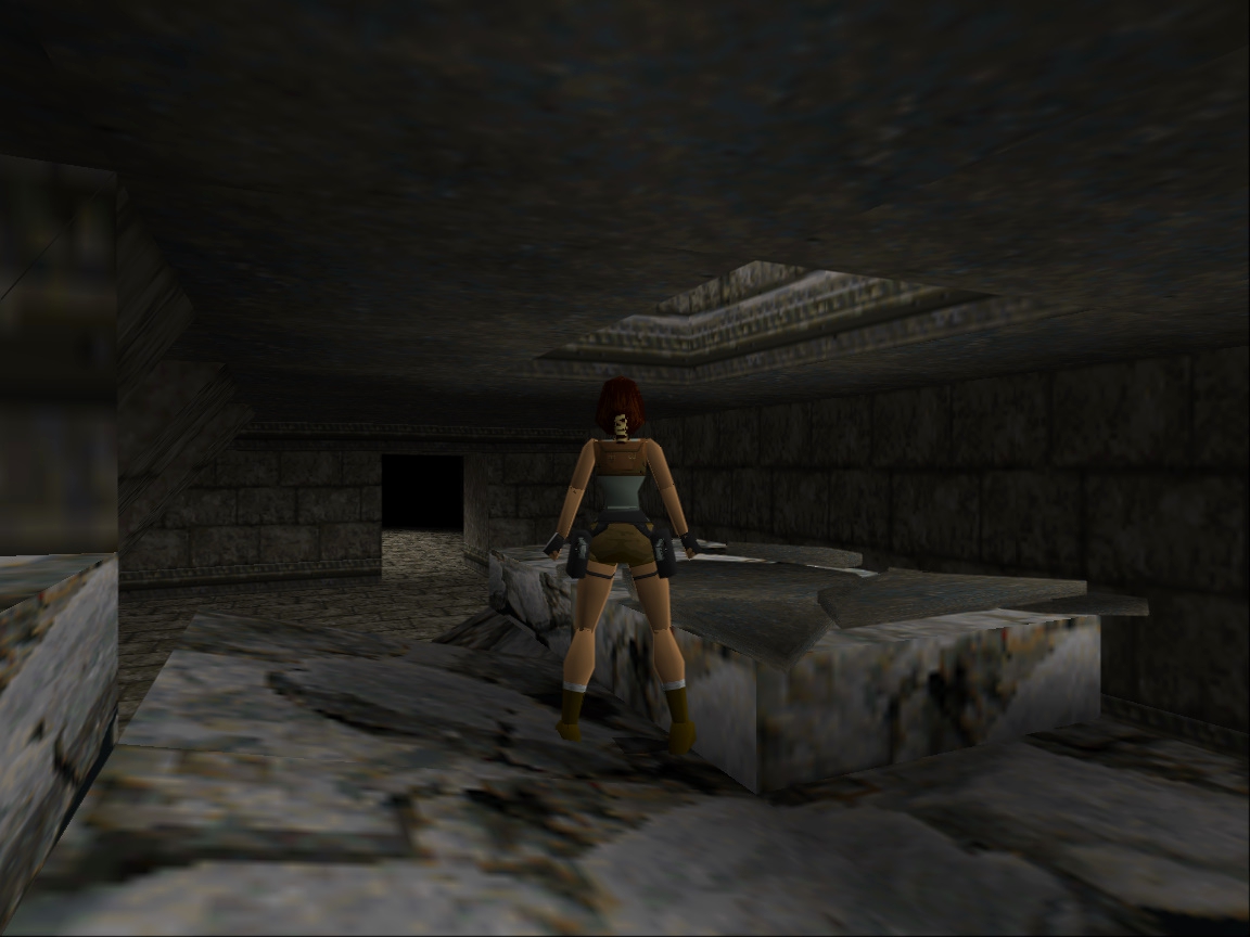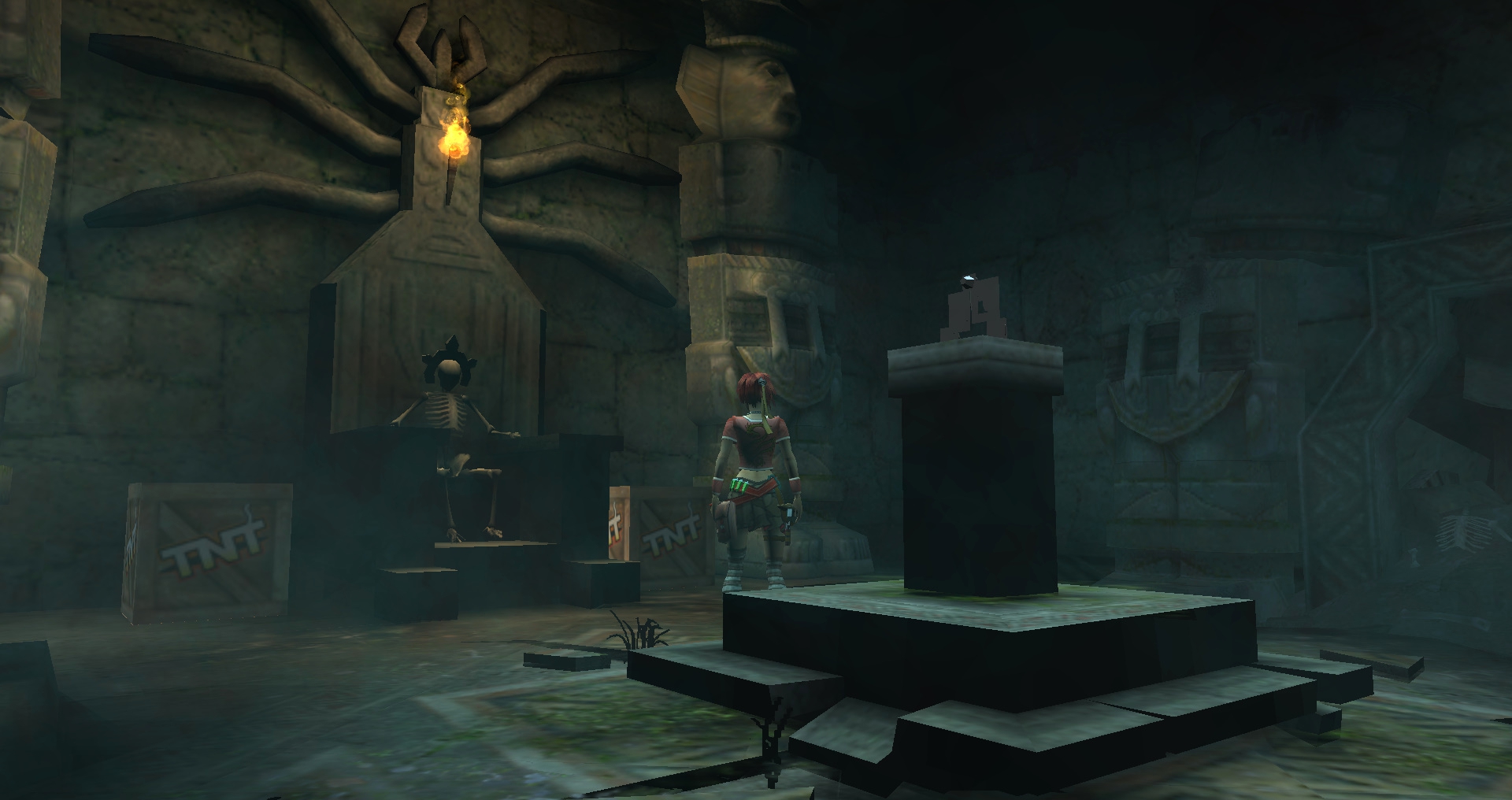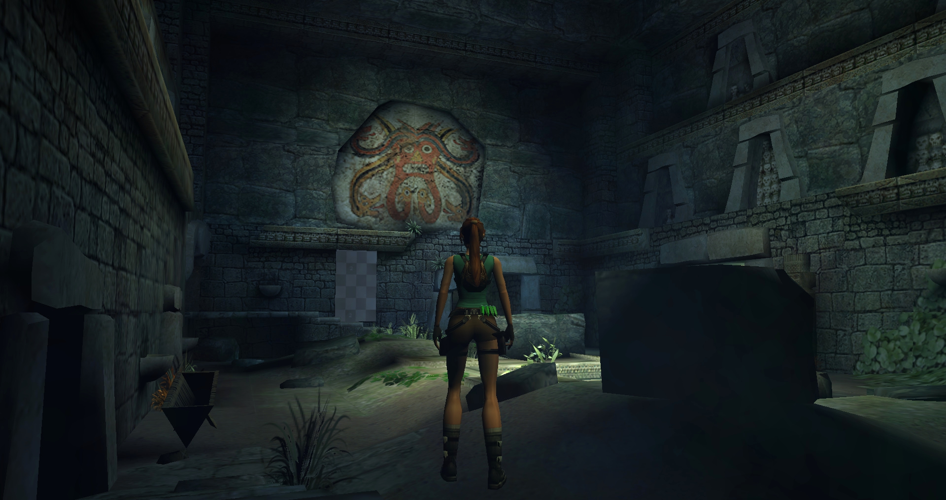 Гробница. Запускается очень проблемно, через каждый шаг – тонна ошибок. Много дырявых мест и объектов, которые не имеют своих текстур на PC. В заготовках имеются две кат.сцены: катящийся валун и Лара смотрящая на скелет Куалопека.
