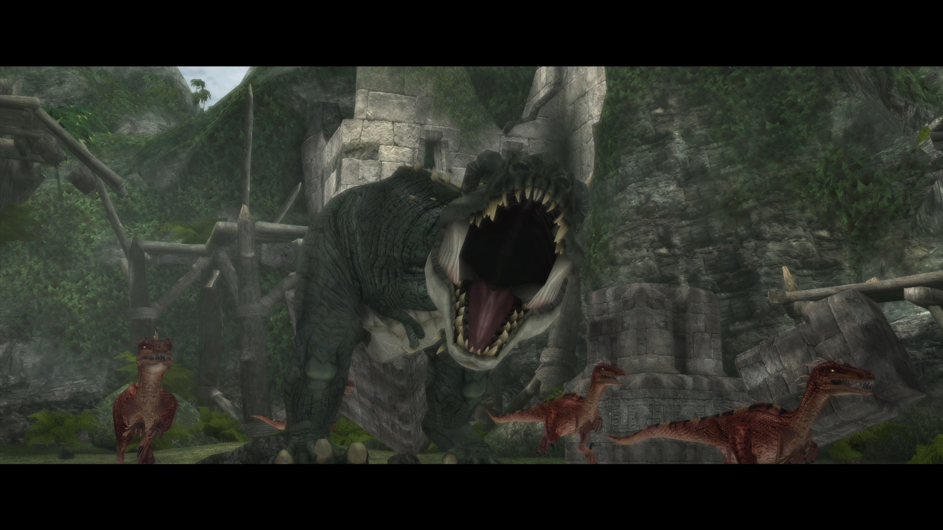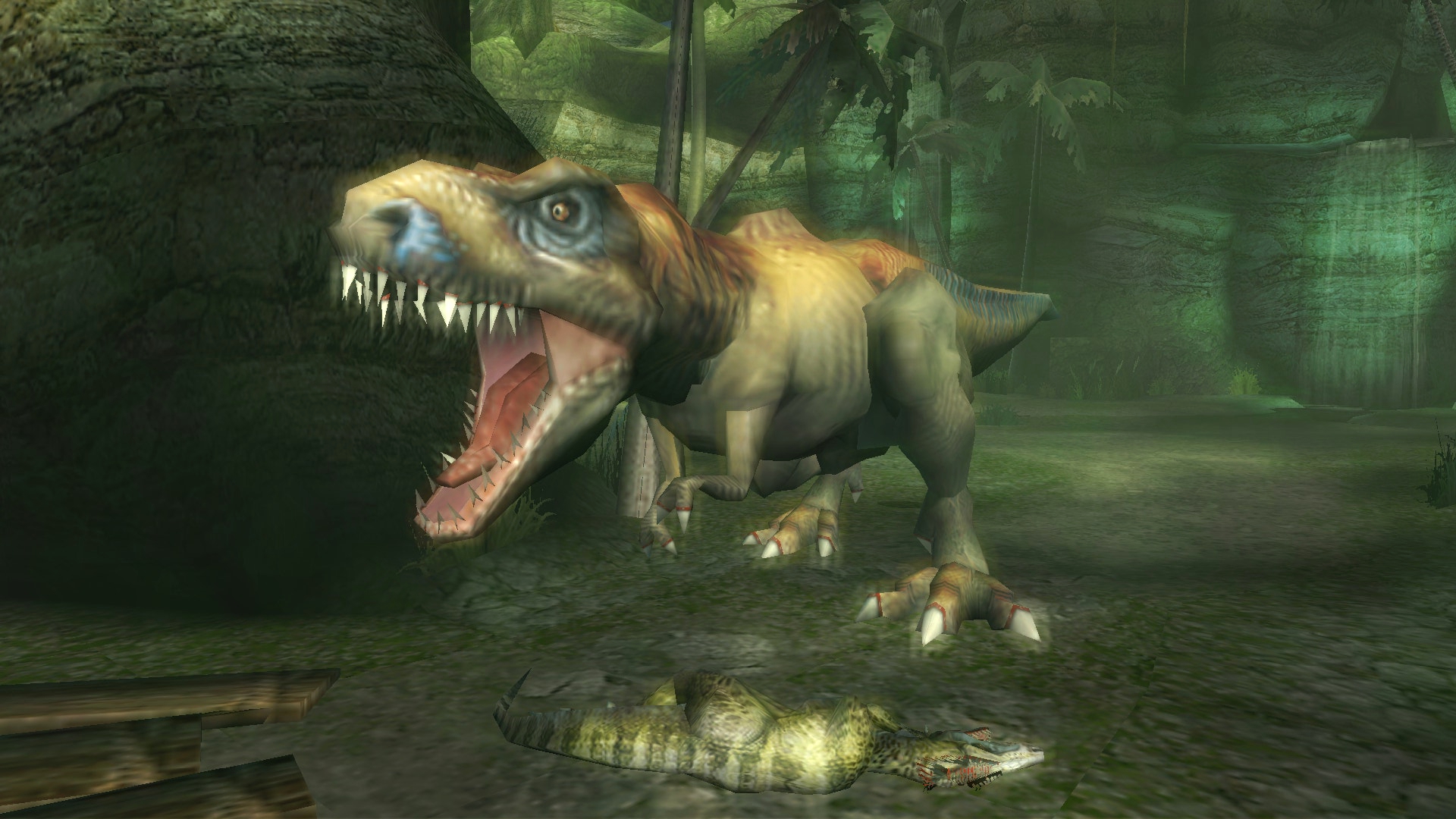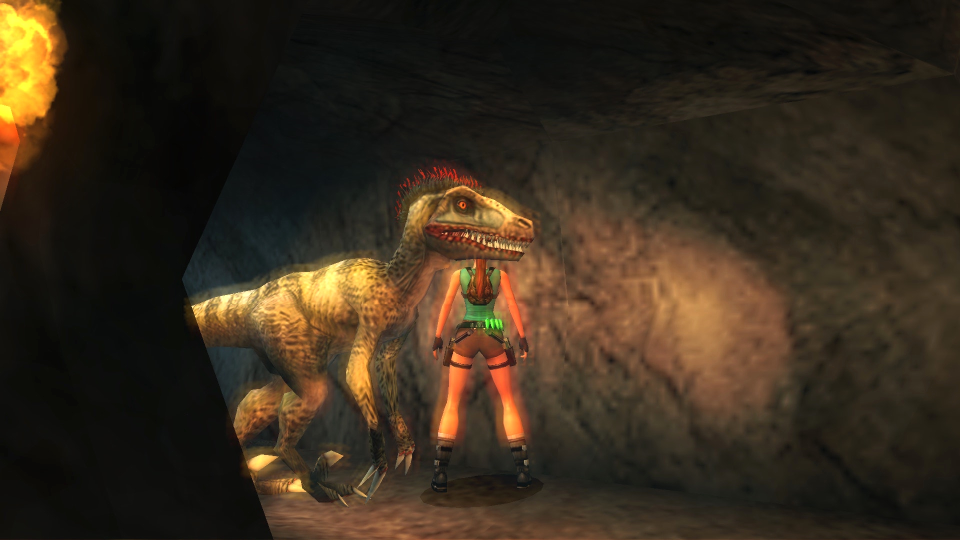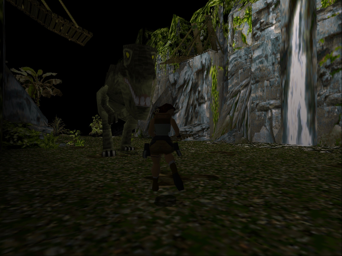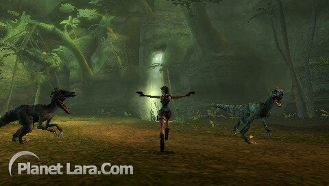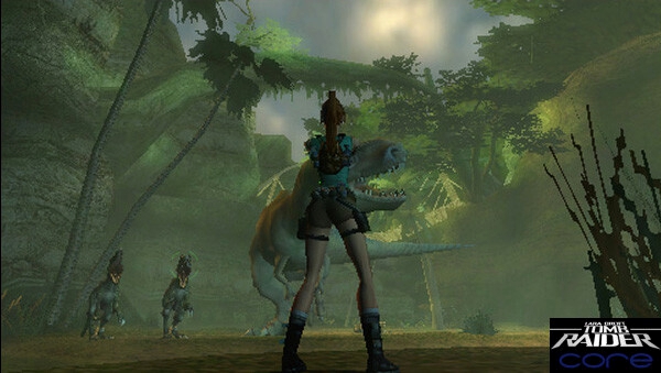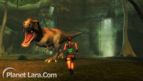 Сценка с Тиранозавром, которая проигрывается исключительно в PSP версии. Более того, в PSP велоцирапторы есть и они атакуют Лару, их даже можно убить, то же самое касается и Тиранозавра! Правда, к Тираннозавру есть вопросы, ибо его смерть сопровождается анимацией, что его будто закалывают копьями... Странная анимация, возможно они планировали сделать бой ближе не к оригиналу 1996 года, а к ремейку 2007 года, где есть шипы, на которые можно насадить Тиранозавра.