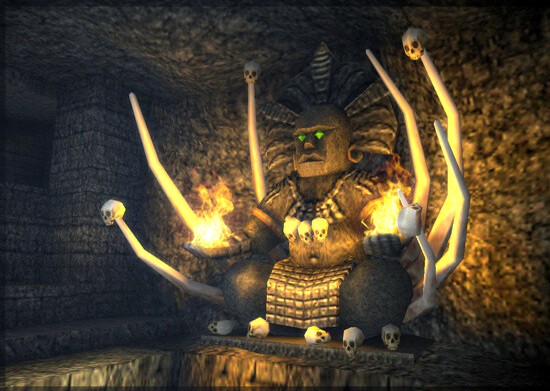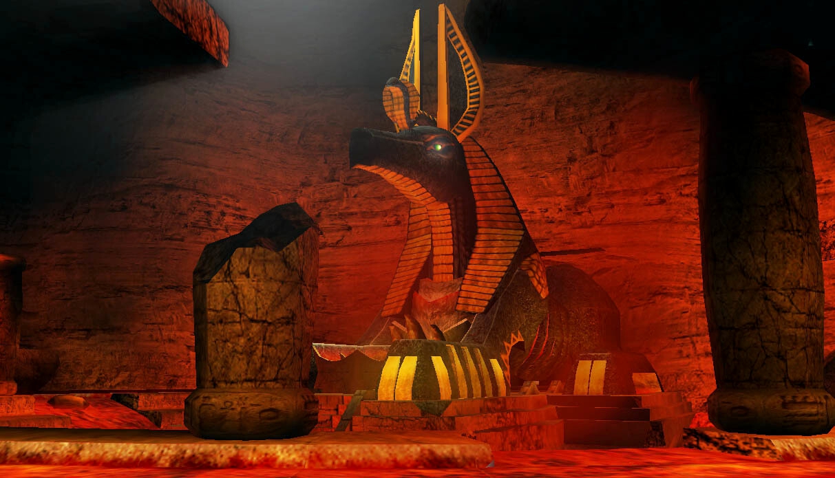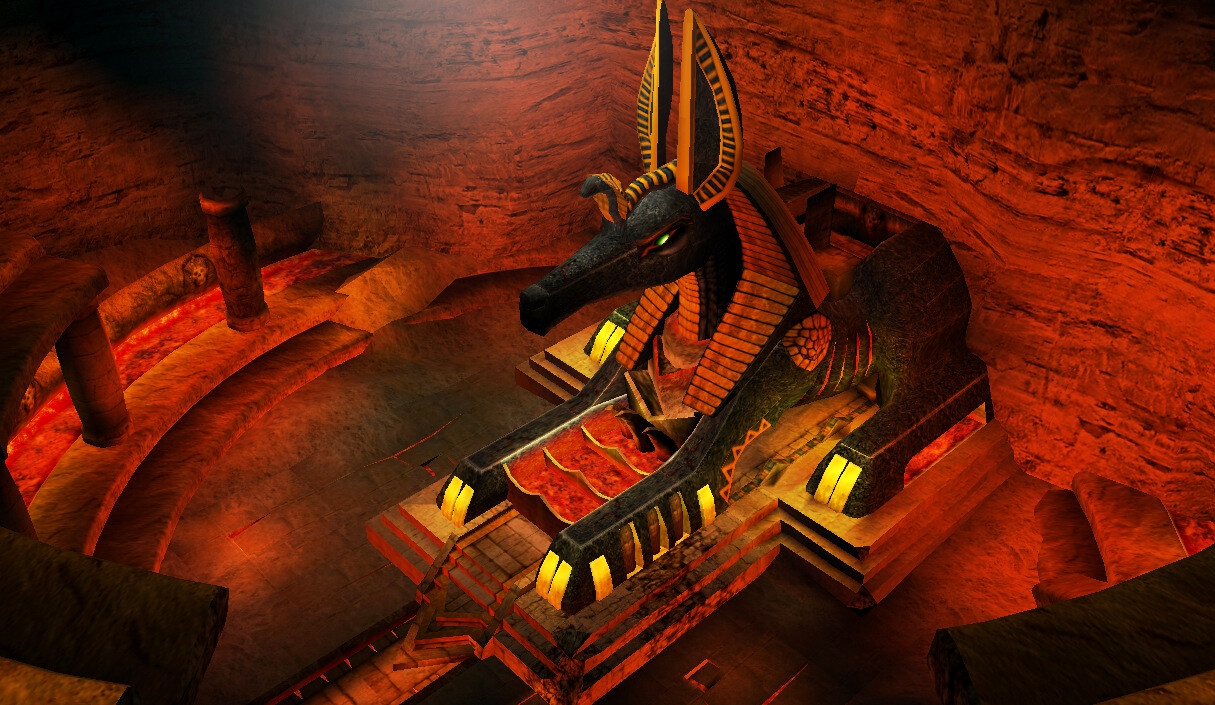 Интересно то, что материал для прессы снова доказывает, что у нас – ранний билд игры. На скриншотах, возле лавы, красуется вовсе не сфинкс, а статуя Анубиса. Более того, локация могла разрушаться, что указывает на введение новых сцен в игру.