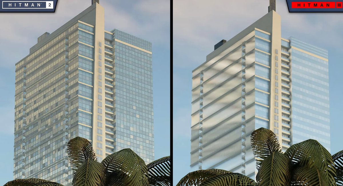 Интересно, что кое-где пропали мелкие детали. Например, небоскреб из Hitman 2 выглядит реалистичнее, чем в превью-версии Hitman 3, где он лишился большей части окон на фасаде. Впрочем, таких отличий очень мало.