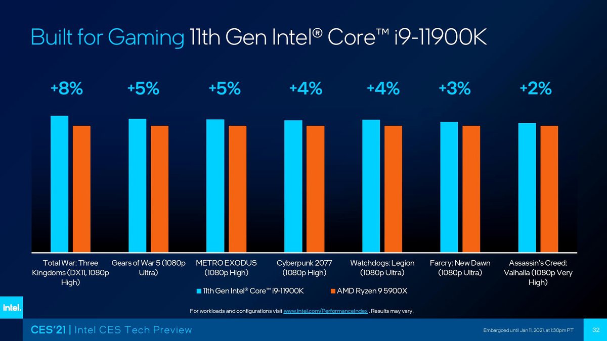 Согласно презентации Intel, в играх Core i9-11900K сопоставим с процессором Ryzen 9 5900X или превосходит его. Судя по последним утечкам, Core i9-11900K несколько быстрее Core i9-10900K и в бенчмарках, и в играх.