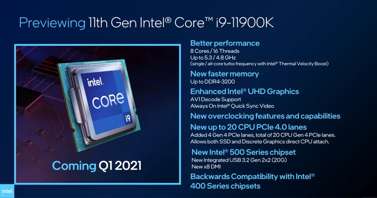 Как и ожидалось, на выставке Consumer Electronics Show корпорация Intel анонсировала новую линейку процессоров на базе архитектуры Cypress Cove. Процессоры будут выпускаться под индексом Core 11XXX, пока представлен только один CPU: топовый Core i9-11900K.