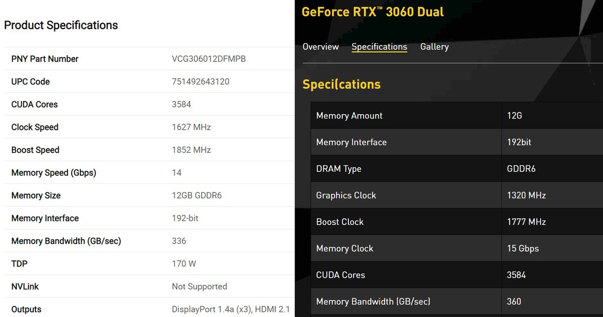 В базах данных ряда производителей, заметили журналисты, сейчас вбиты некорректные характеристики GeForce RTX 3060. Похоже, некоторые партнеры Nvidia по ошибке использовали характеристики, относящиеся к другой видеокарте той же модели: еще не анонсированной версии RTX 3060 с 6 гигабайтами памяти.