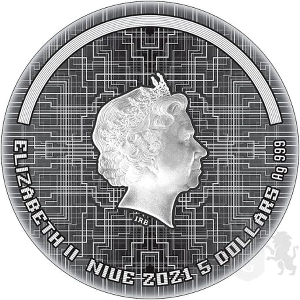 Монета изготовлена из серебра 999 пробы, она весит 62.2 грамма. Аверс украшен стилизованным изображением мира будущего, на реверсе — кибер-версия королевы Елизаветы II. Благодаря использованию флуоресцентной печати монета светится в темноте.
