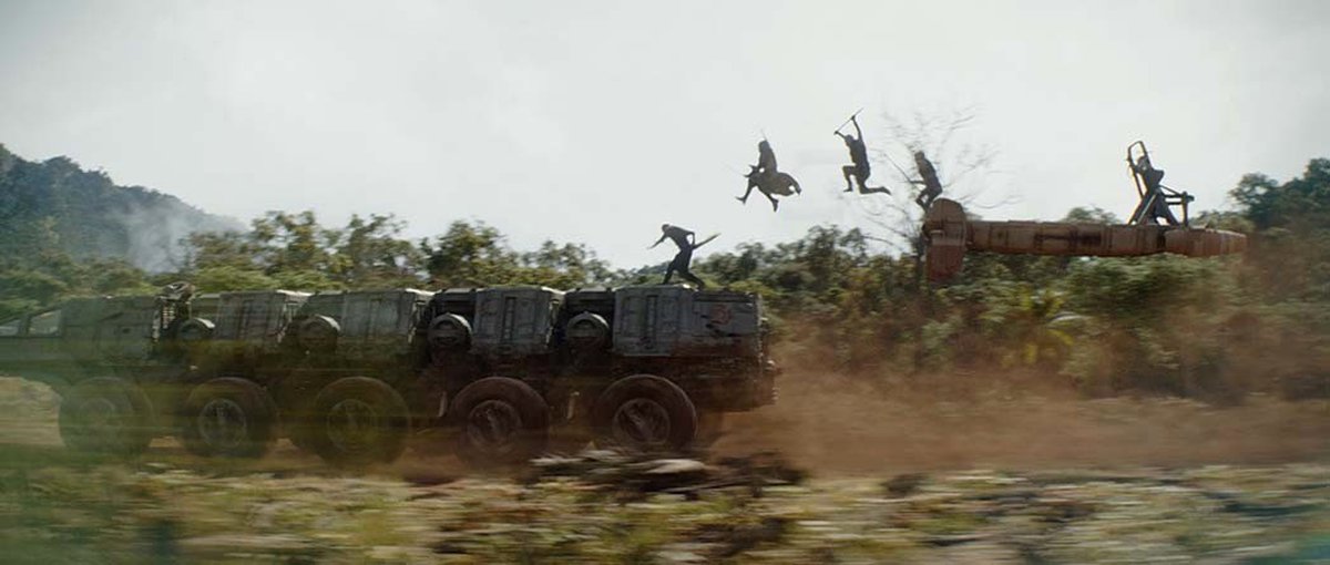 Для сцен погони и драк с пиратами актеров и каскадеров пришлось подвешивать на сложных системах тросов — с их помощью имитировались прыжки между техникой, участвующей в погоне. Технику потом дорисовали с помощью компьютерной графики, но это не делало работу каскадеров проще.