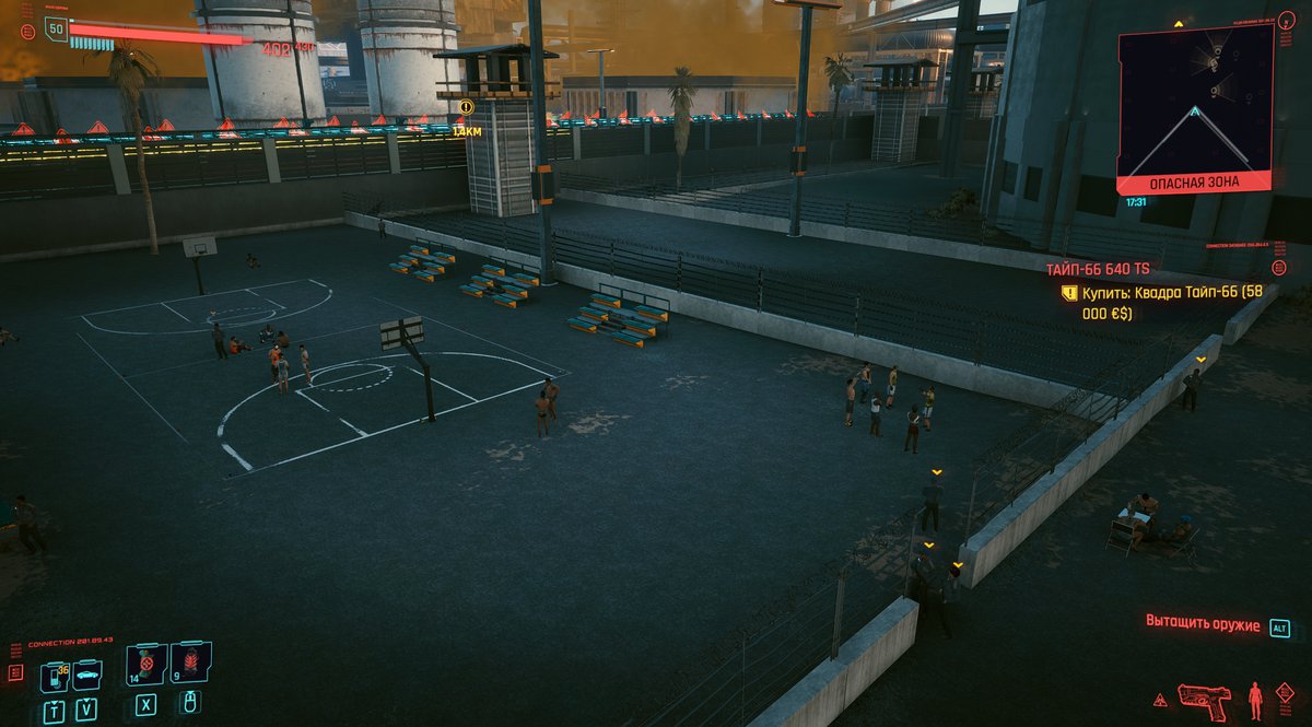 Исследуя город, мы наткнулись на любопытную область в районе Арройо: это одна из окраин Найт-Сити, где размещаются разнообразные заводы. Между парой ужасно дымящих производств Petrochem дизайнеры воткнули область с вышками, колючей проволокой и охраной. Это тюрьма.