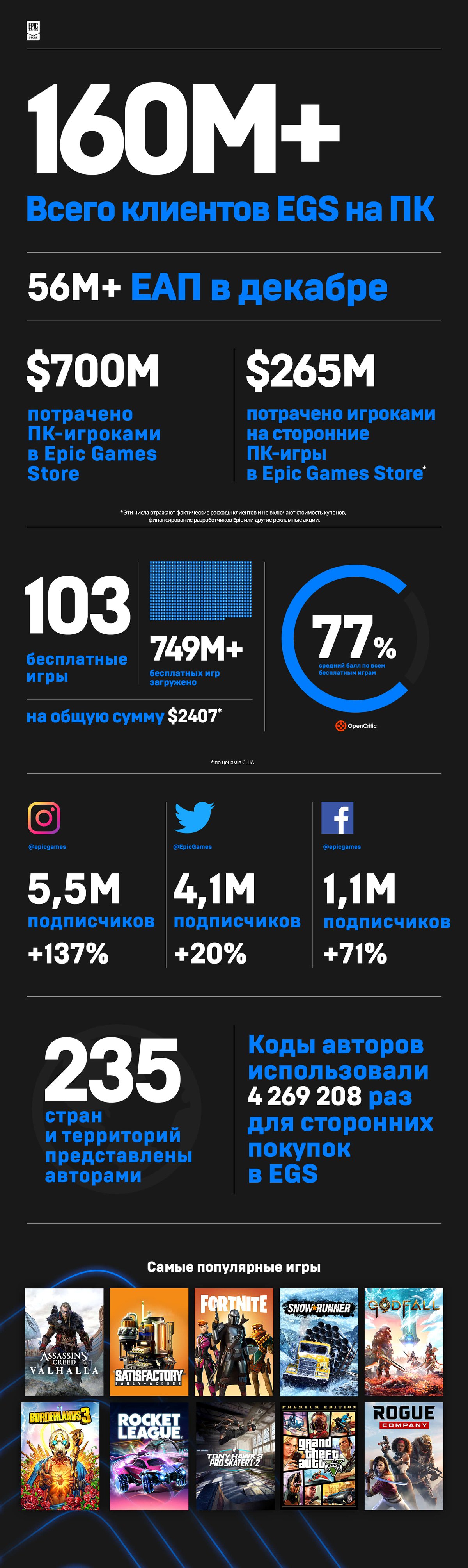 Магазин Epic Games Store опубликовал мини-отчет за 2020 год. Общее количество зарегистрированных пользователей Epic Games Store превысило 160 миллионов, в декабре ежемесячная активная аудитория площадки достигла 56 миллионов игроков.