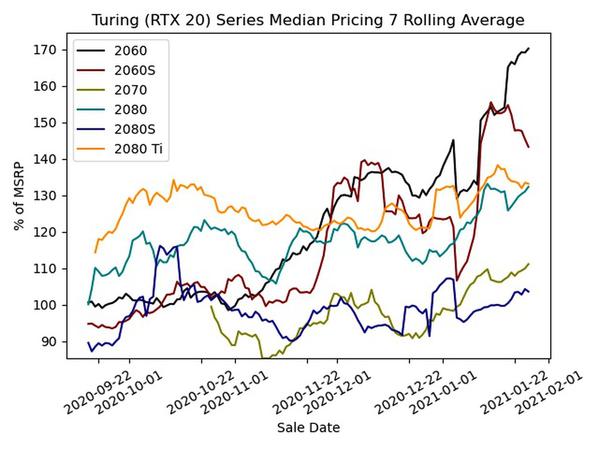 Интересно, что видеокарты Nvidia предыдущего поколения также пользуются спросом у перепродавцов. В последнее время цены растут практически на все карты линейки GeForce RTX 2000, особенно активный рост демонстрирует RTX 2060.