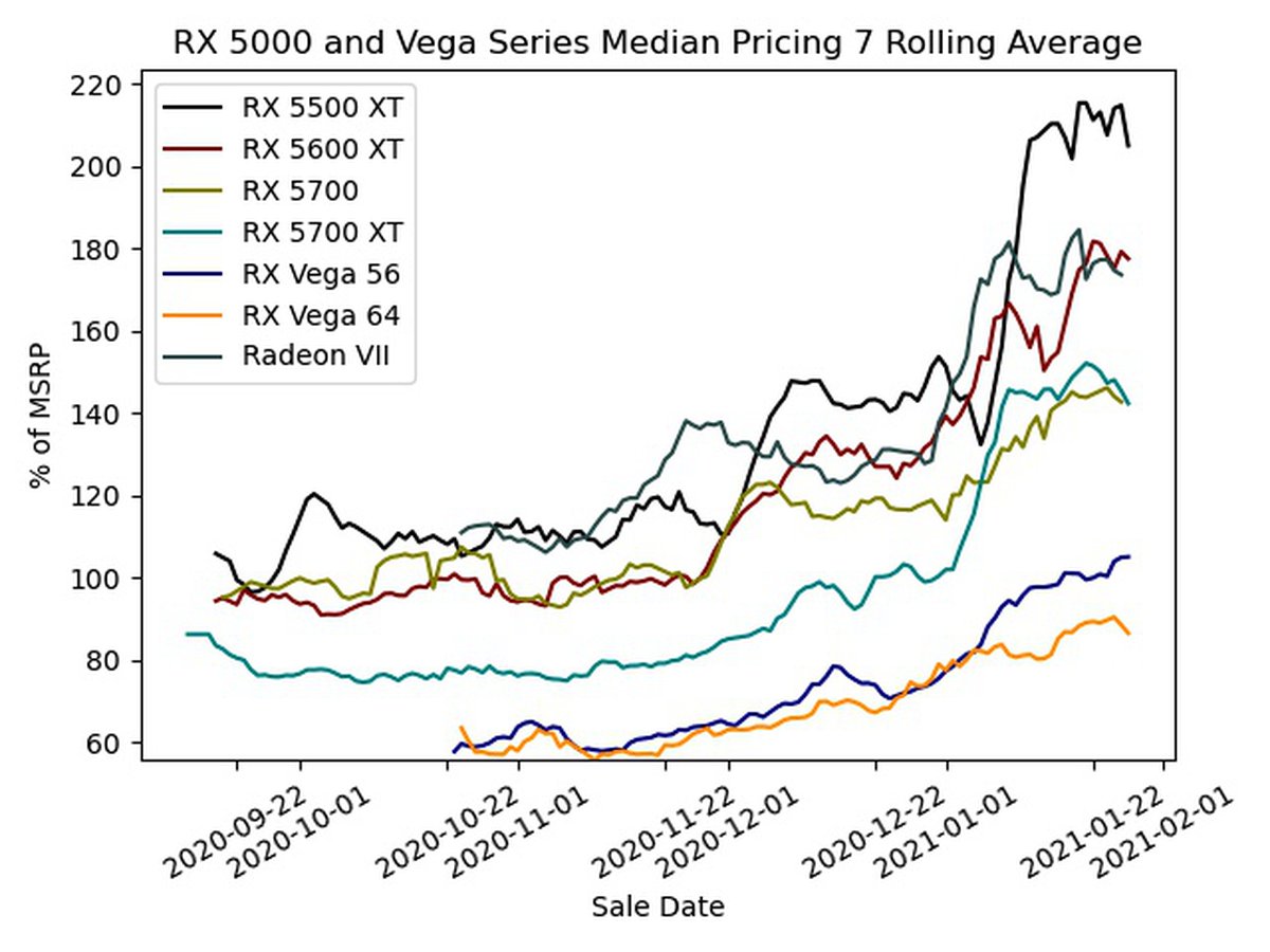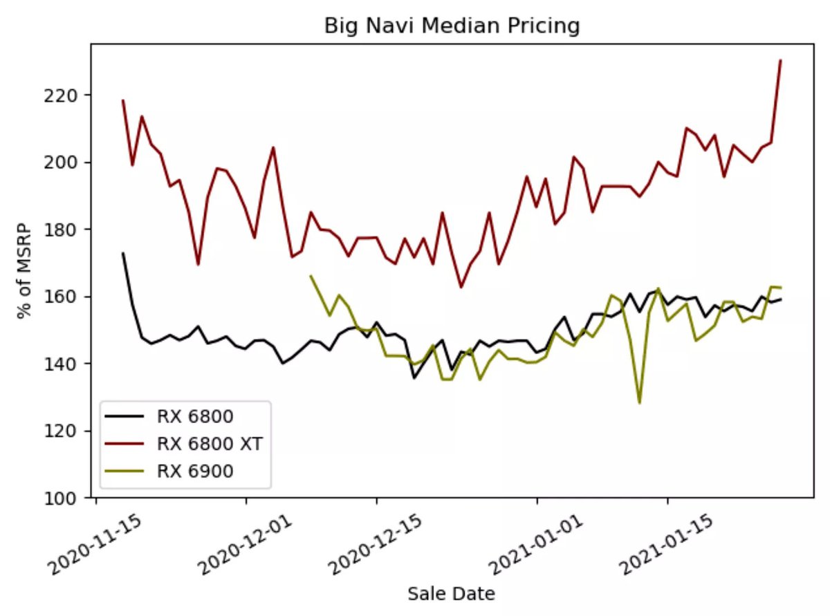 Дороже всего уходит Radeon RX 6800 XT. Примечательно, что у топовой Radeon RX 6900 и более бюджетной Radeon RX 6800 цены в процентном соотношении меняются почти идентично.