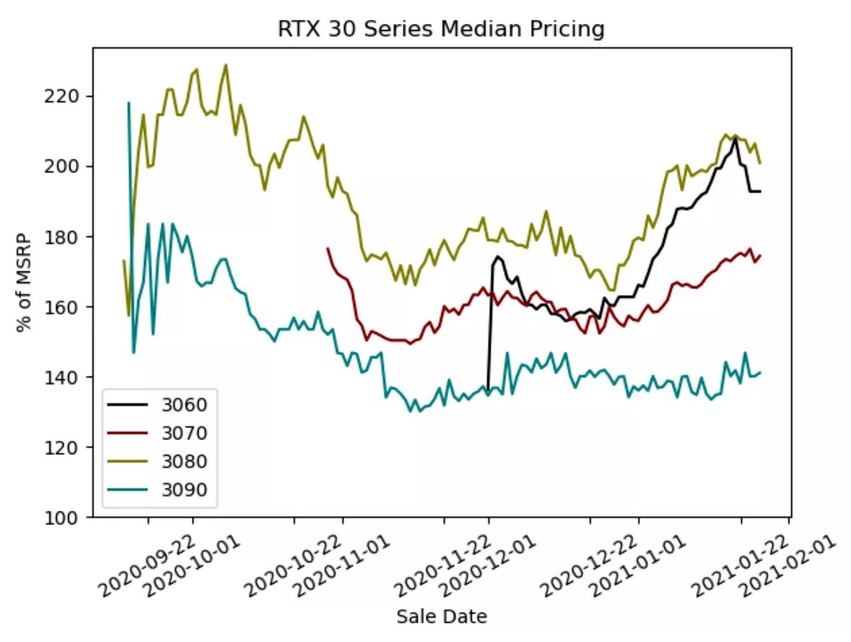 Проанализировав стоимость проданных видеокарт, Дрисколл обнаружил, что меньше всего цены накручивались на GeForce RTX 3090. Лидером почти всегда оставалась GeForce RTX 3080, в последние месяцы с ней соперничает GeForce RTX 3060 Ti.