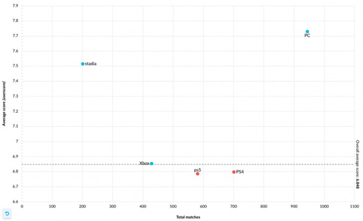 Игроки на PC оценивают Cyberpunk 2077 почти на балл выше, чем владельцы консолей: средняя оценка на PC это 7.7 из 10, на консолях — порядка 6.8-6.9 из 10. Немногочисленные пользователи Stadia ближе к PC, чем к консолям.