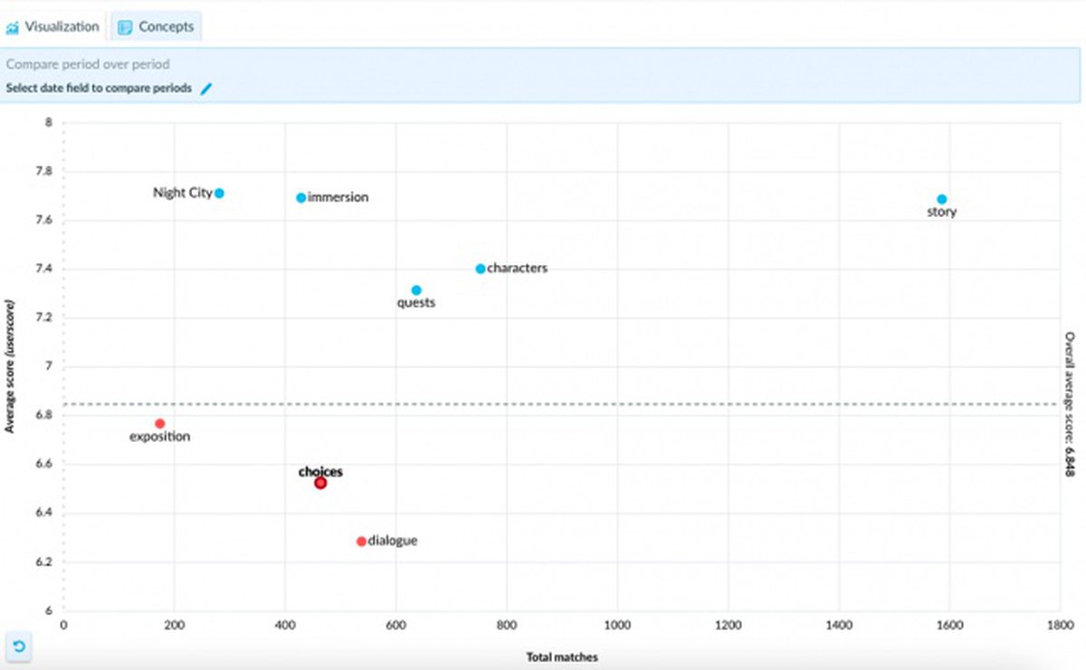 Команда сервиса Luminoso Daylight, занимающегося анализом разговорных текстов, прогнала через свою модель около 3700 отзывов на Cyberpunk 2077. Отзывы, взятые с Metacritic, были написаны между 11 декабря и 7 января, их авторы в среднем поставили игре 6.85 балла из 10.