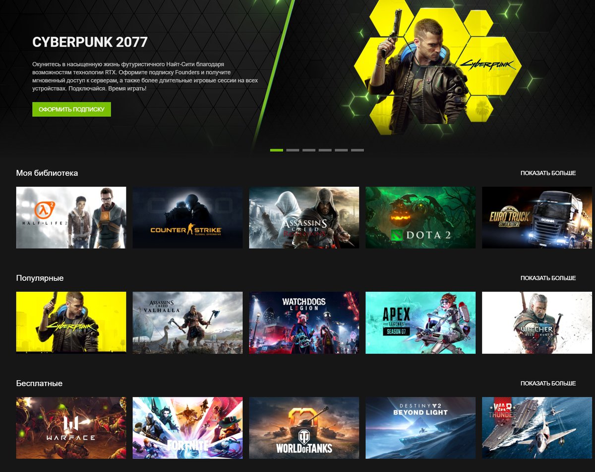 Сейчас веб-версия GeForce Now работает только в браузерах на движке Chromium — то есть практически во всех современных браузерах. Интерфейс веб-версии близок к приложению GeForce Now.