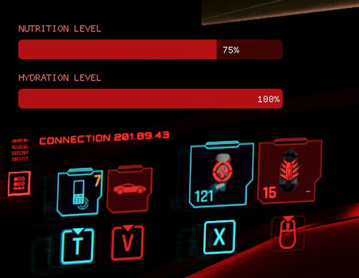 Если один из показателей упадет до нуля, то на экран будет выводиться эффект, имитирующий глюки аугментаций Ви. Чтобы избавиться от него, надо снова накормить или напоить главного героя. Убивать обезвоженного или голодающего Ви модификация пока не будет.
