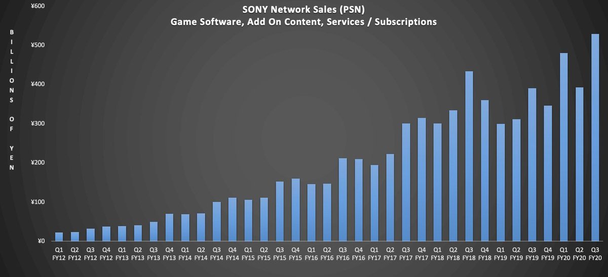 Нынешняя рекордная выручка, полагает Ахмад, стала следствием удачной цифровой трансформации игрового подразделения Sony. Это хорошо иллюстрирует другой график: здесь показана выручка, сгенерированная PlayStation Network.