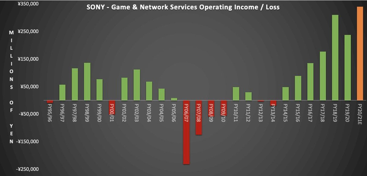 Новые поколения PlayStation выходили на рынок в 1995, 2000, 2006 и 2013 финансовых годах соответственно. Во всех случаях Sony несла убытки; особенно серьезной просадка оказалась после неудачного запуска PlayStation 3.