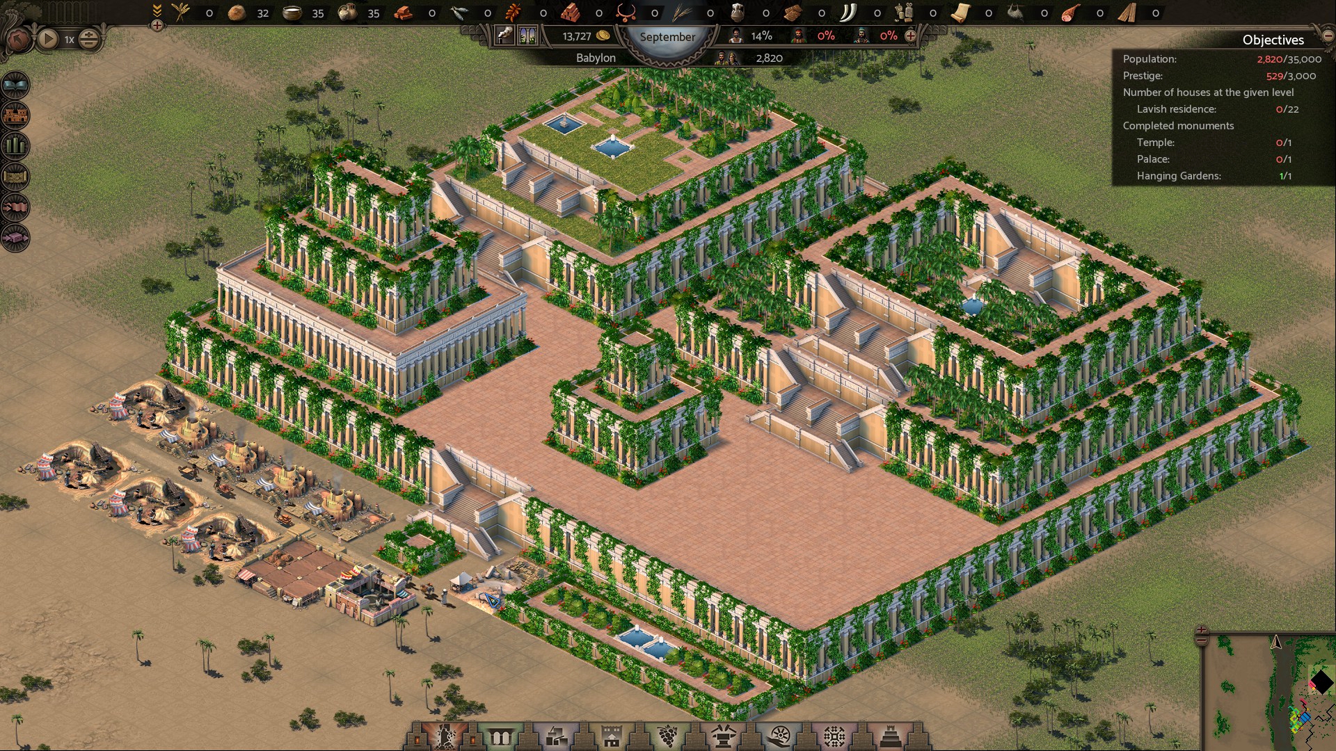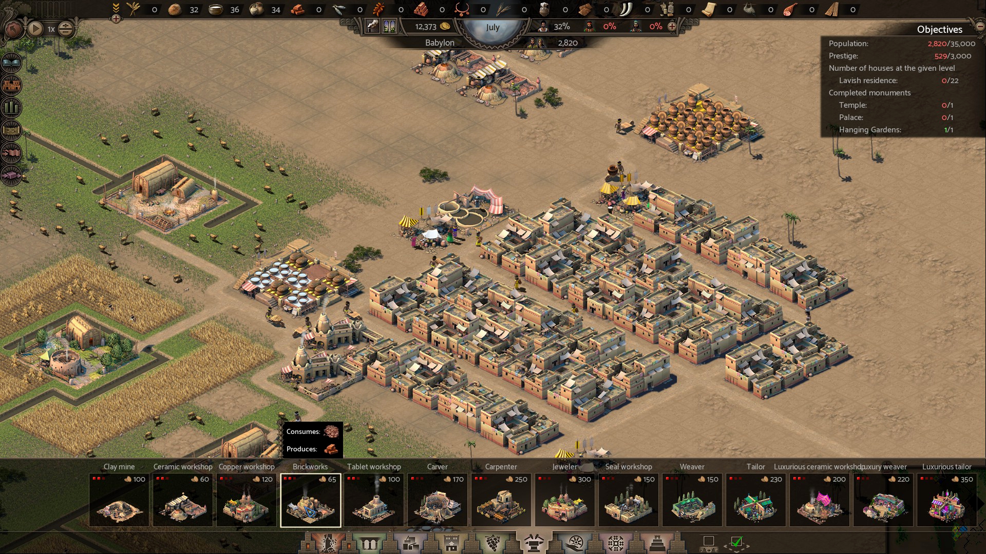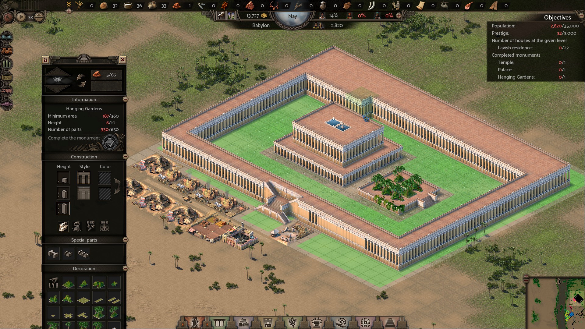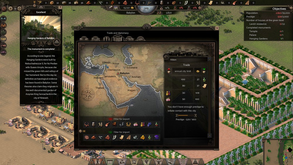 По престижу существует некоторый лайфхак. Он также повышается от возведения гигантских монументов. Процесс изготовления тонны кирпича довольно долгий, поэтому стоит начать строительство Висячих Садов заранее.