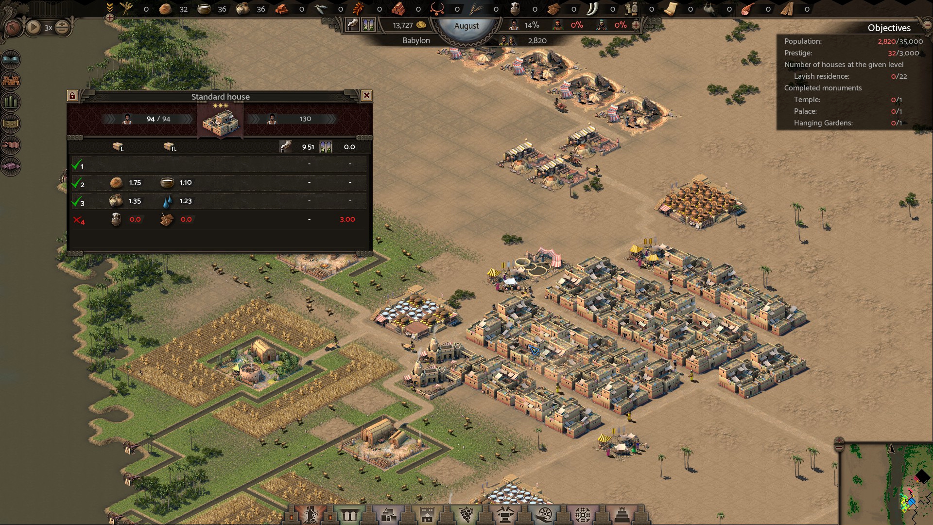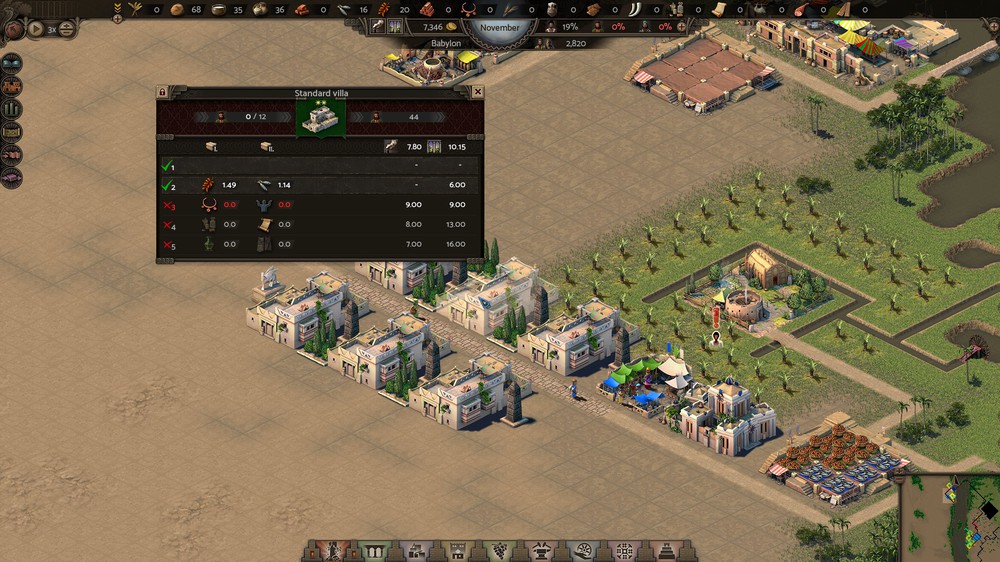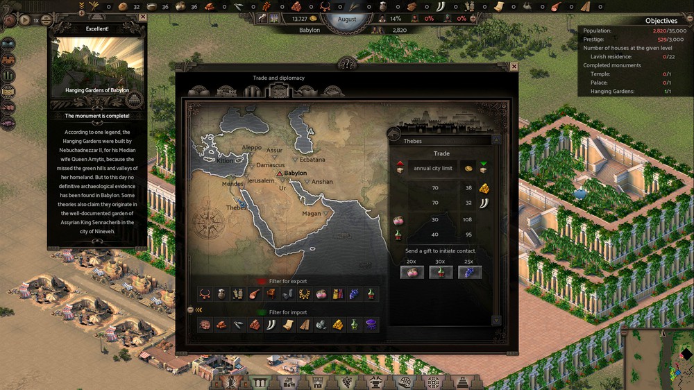 Стоит так же понимать, что, если торговля в миссии доступна, значит, возможно, что-то придётся и покупать. Например, бронзу, без которой украшения для среднего сословия не сделать. На помощь придут влияющие на цены отношения с другими городами. Они растут по мере самой торговли и выполнения квестов на отправку ресурсов. Правда, провал таких задачек отношения понижает.