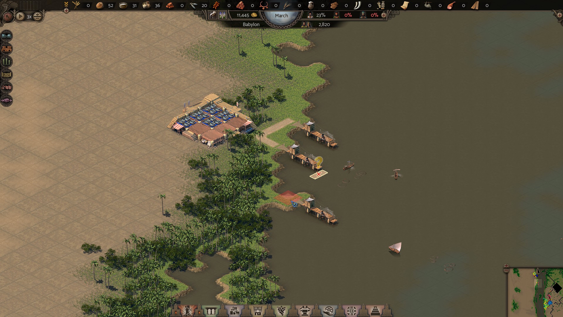 Торговля, кстати, только водно-портовая, что исторично для междуречья. Самый сок в том, что никто с неизвестной деревней вести дела не будет. У поселения есть показатель престижа, который какой-то хитрой формулой складывается из кол-ва благополучных домиков. К тому же, чтобы открыть те самые маршруты, надо сделать первый взнос ресурсами.