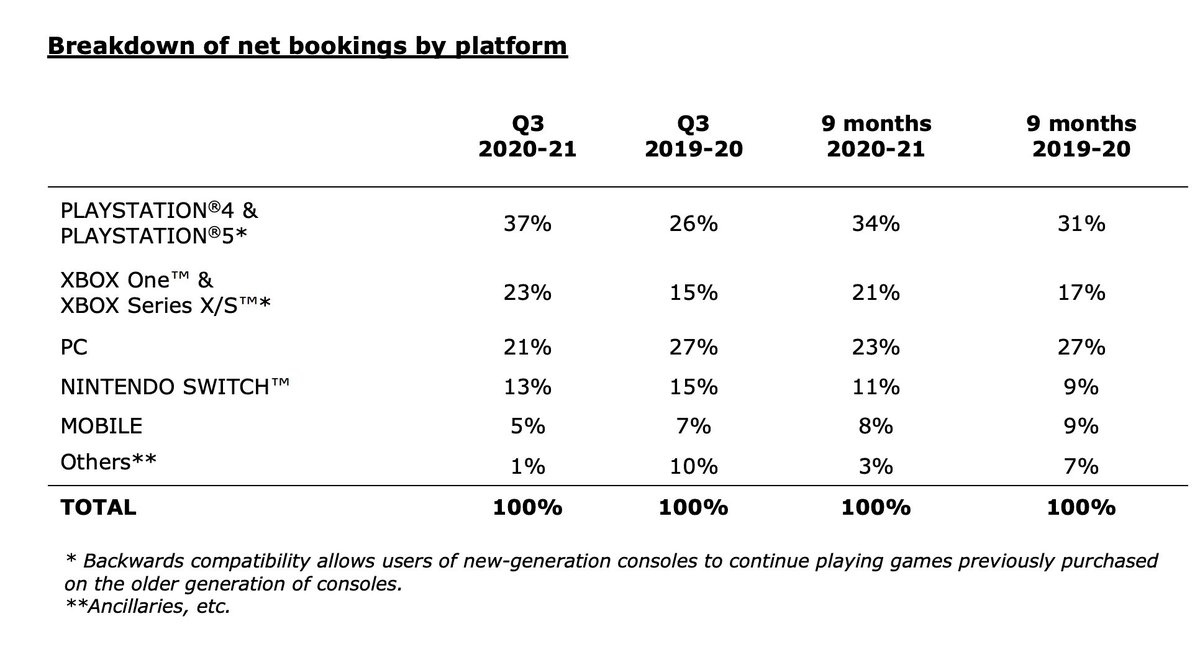 В отчете Ubisoft отмечается, что компания стала крупнейшим издателем в мире по объему продаж на всех платформ. Основными драйверами роста для компании стали Assassin's Creed Valhalla, Just Dance и микротранзакции. Сейчас микротранзакции приносят Ubisoft примерно треть всей выручки.