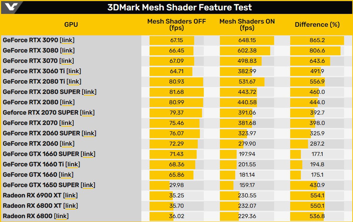 Судя по результатам первых тестов, сгруппированным VideoCardz, видеокарты линейки Radeon RX 6000 работают с меш-шейдерами в несколько раз медленнее топовых решений Nvidia. Интересно, что с отключенными шейдерами карты Nvidia тоже впереди.