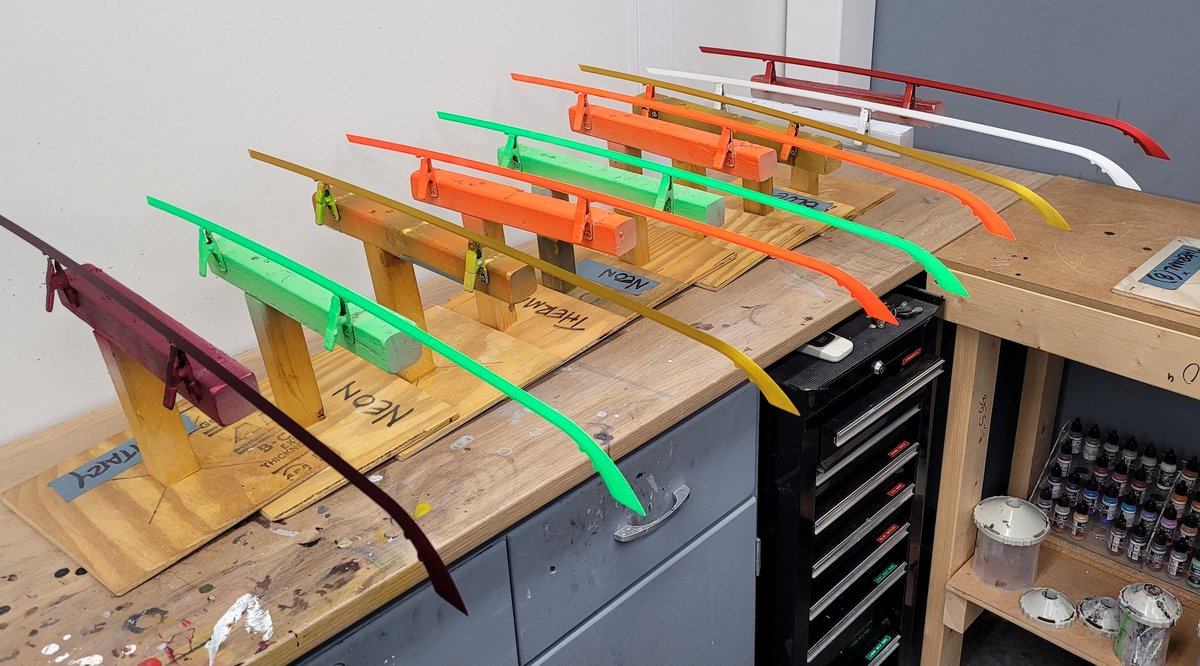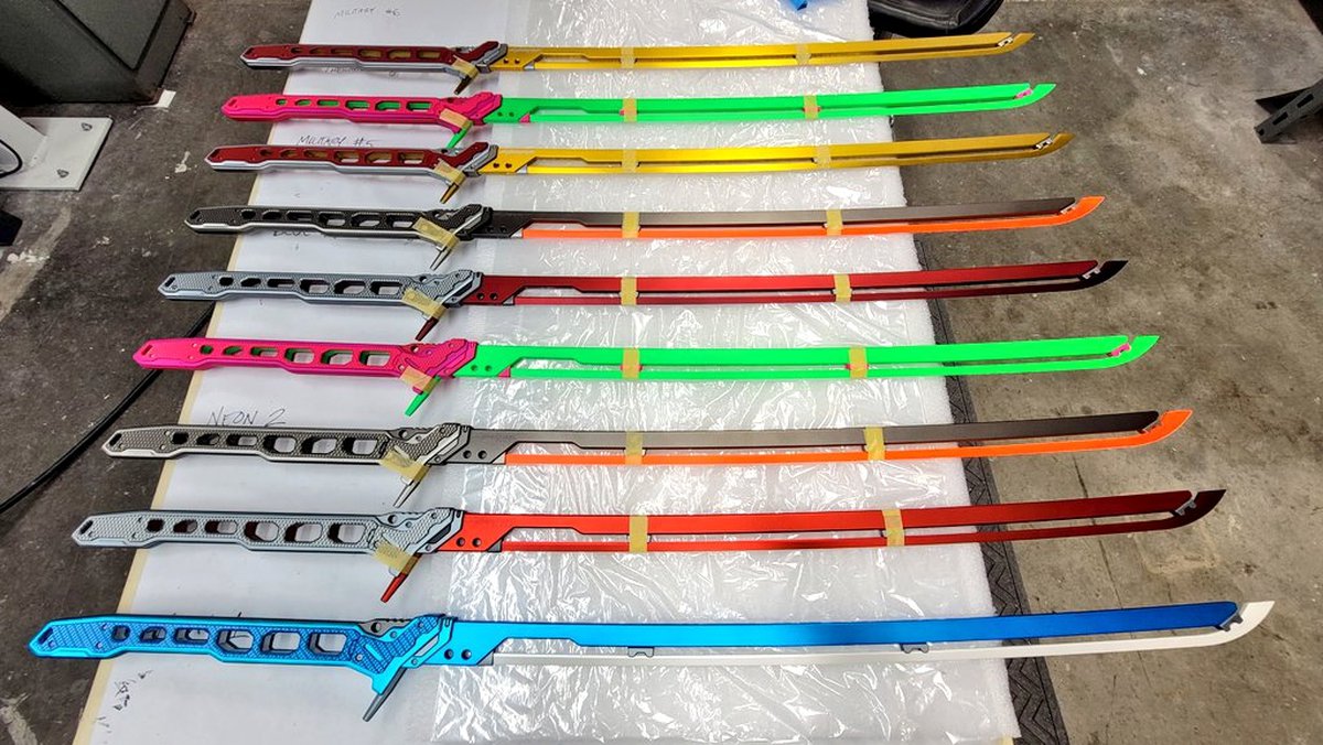 Харрисон Крикс, основатель мастерской Volpin Props, почти закончил работу над набором катан из Cyberpunk 2077. Он состоит из девяти мечей, окрашенных в разные цвета — они примерно соответствуют игровым расцветкам.