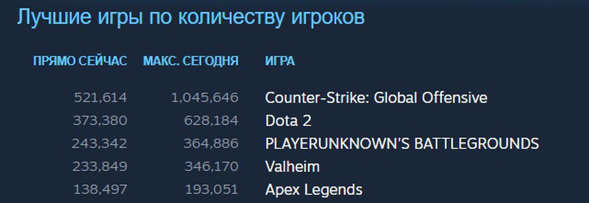 Судя по динамике, уже сегодня Valheim может обогнать PUBG и подняться на третье место в топе Steam. Dota 2, кажется, пока можно не беспокоиться: разрыв с ней все еще слишком велик.