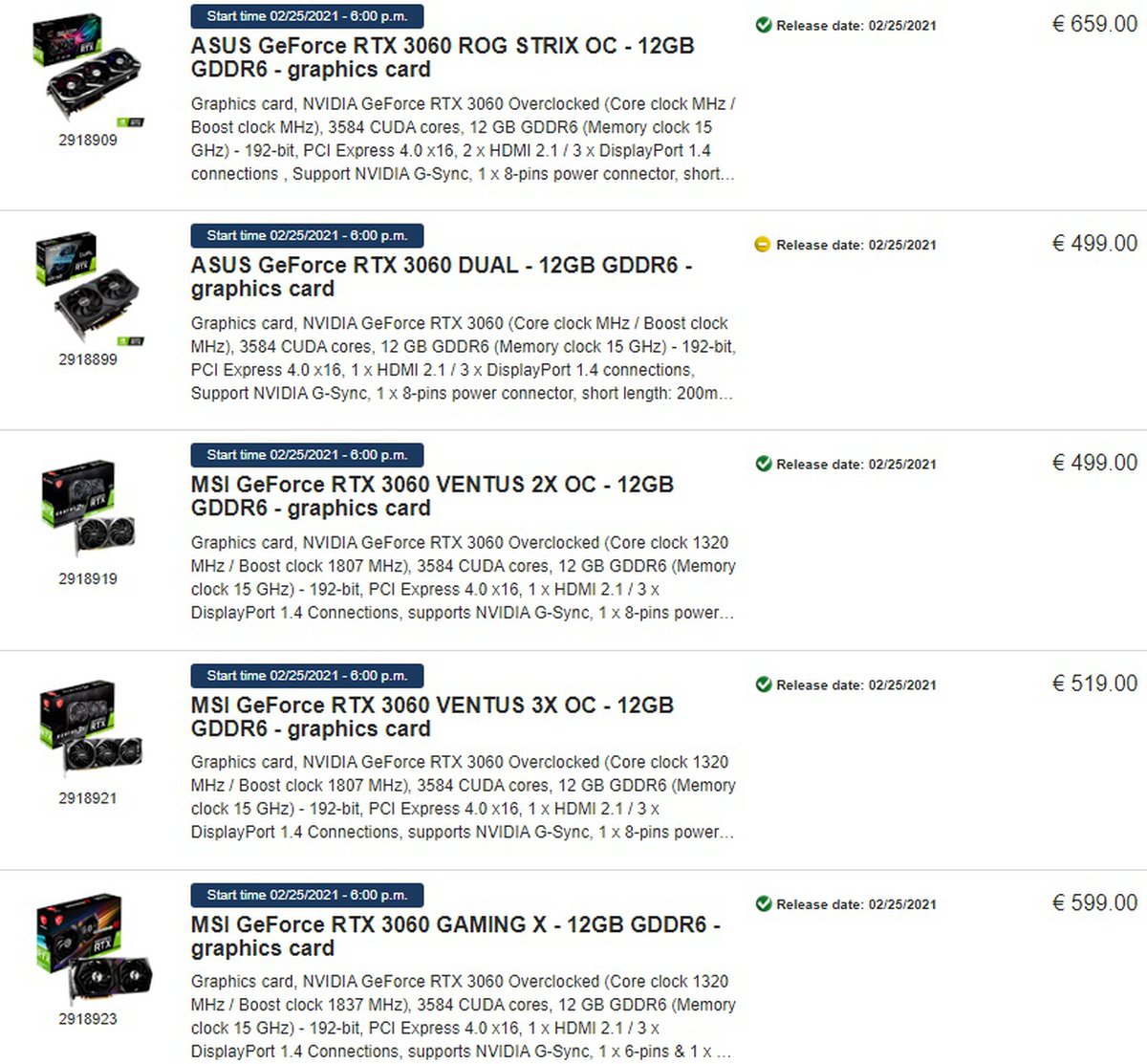 Предполагалось, что из-за соглашения с Nvidia ритейлерам придется продать хотя бы часть карт по рекомендованным ценам. Видимо, это не так: например, у ProShop, работающего в нескольких странах Европы, GeForce RTX 3060 предлагается предзаказать за 499 евро вместо 329 евро. Или еще дороже.