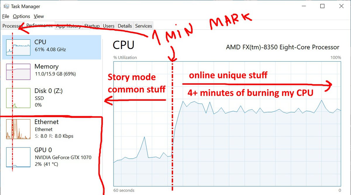 Затем t0st решил посмотреть, как вообще происходит загрузка онлайн-режима. Оказалось, что большую часть времени GTA Online грузит на 100% одно из ядер процессора, не создавая нагрузку ни на сеть, ни на диск, ни на память. Это было странно.