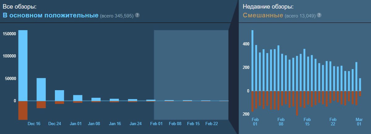 2 февраля игроки оставили к Cyberpunk 2077 330 положительных и 126 отрицательных обзоров. Три недели спустя, 25 февраля, число положительных обзоров упало до 172, а число отрицательных почти не изменилось — их 122.