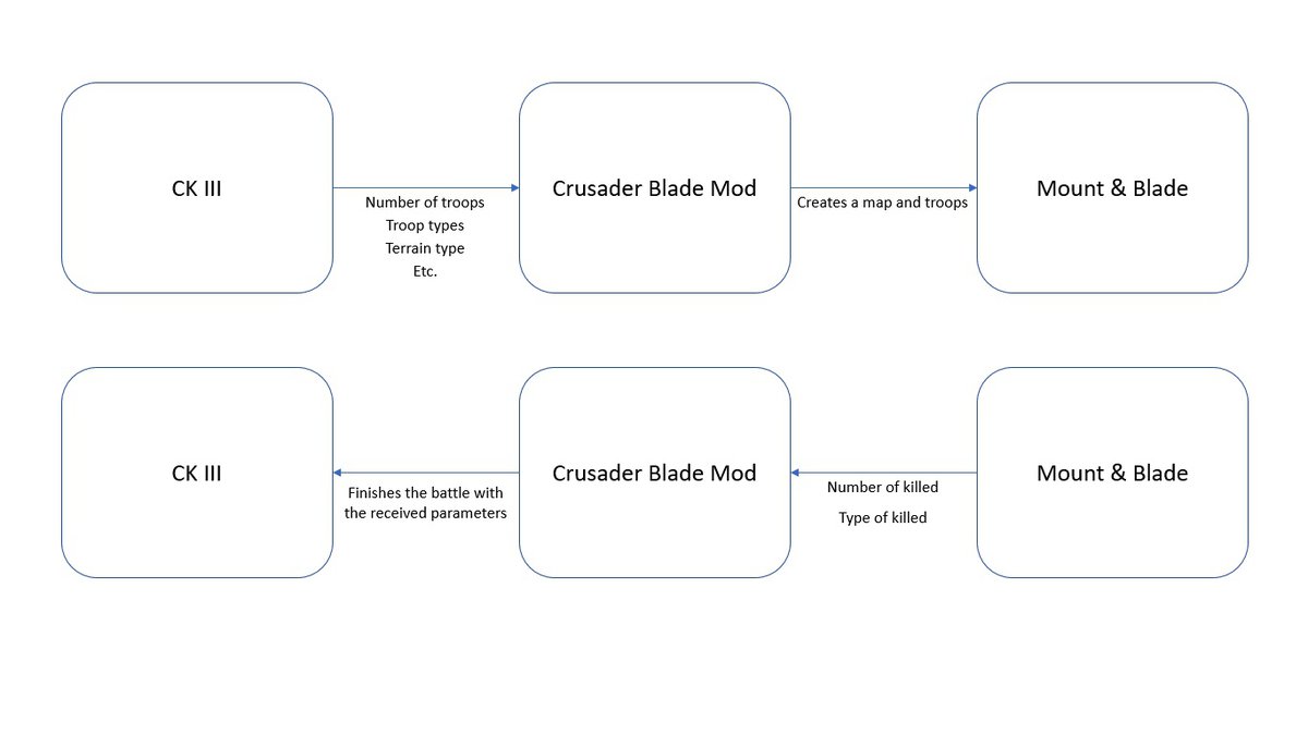 Для этого, рассказывает моддер, между двумя играми был реализован обмен данными. Когда в Crusader Kings 3 начинается сражение, в Mount and Blade 2 генерируется битва на подходящей карте с нужным количество юнитов.