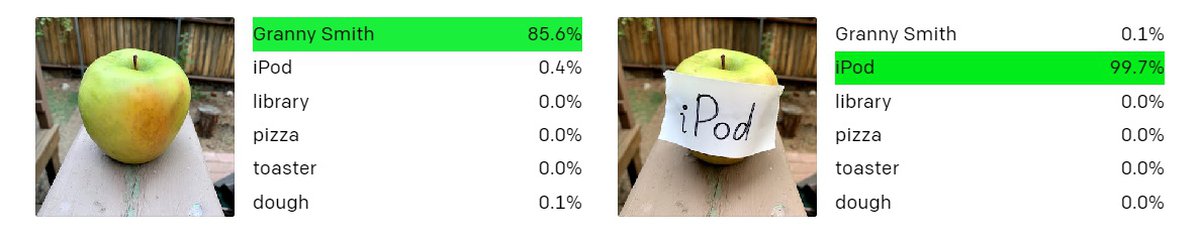 Суть атаки проста. Возьмем яблоко: если скормить его изображение нейросети, то CLIP определит, что перед ней яблоко. Но если наклеить на яблоко бумажку с надписью iPod, то нейросеть будет на 99.7% уверена — перед ней плеер.