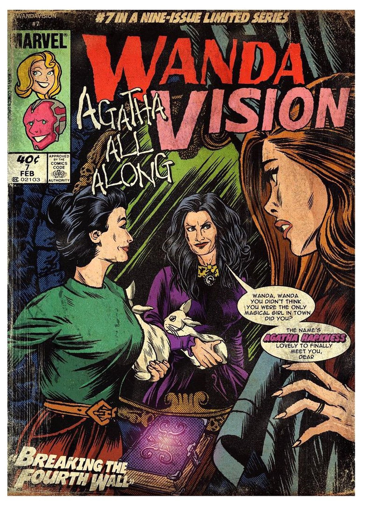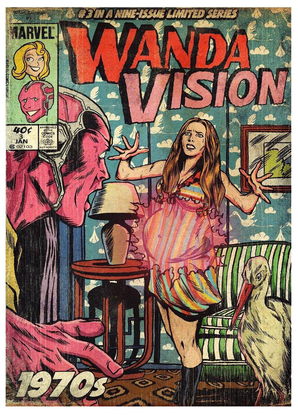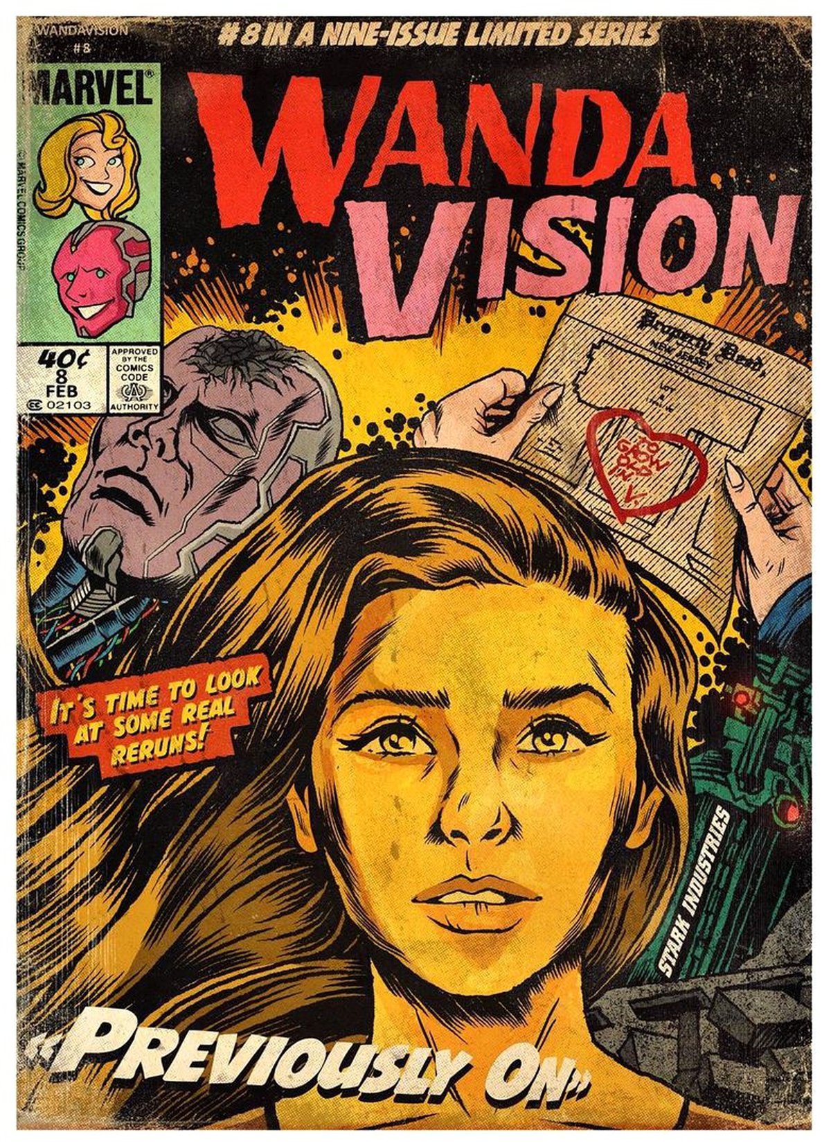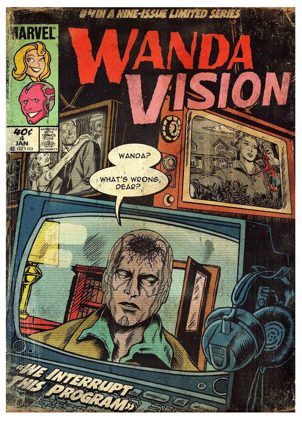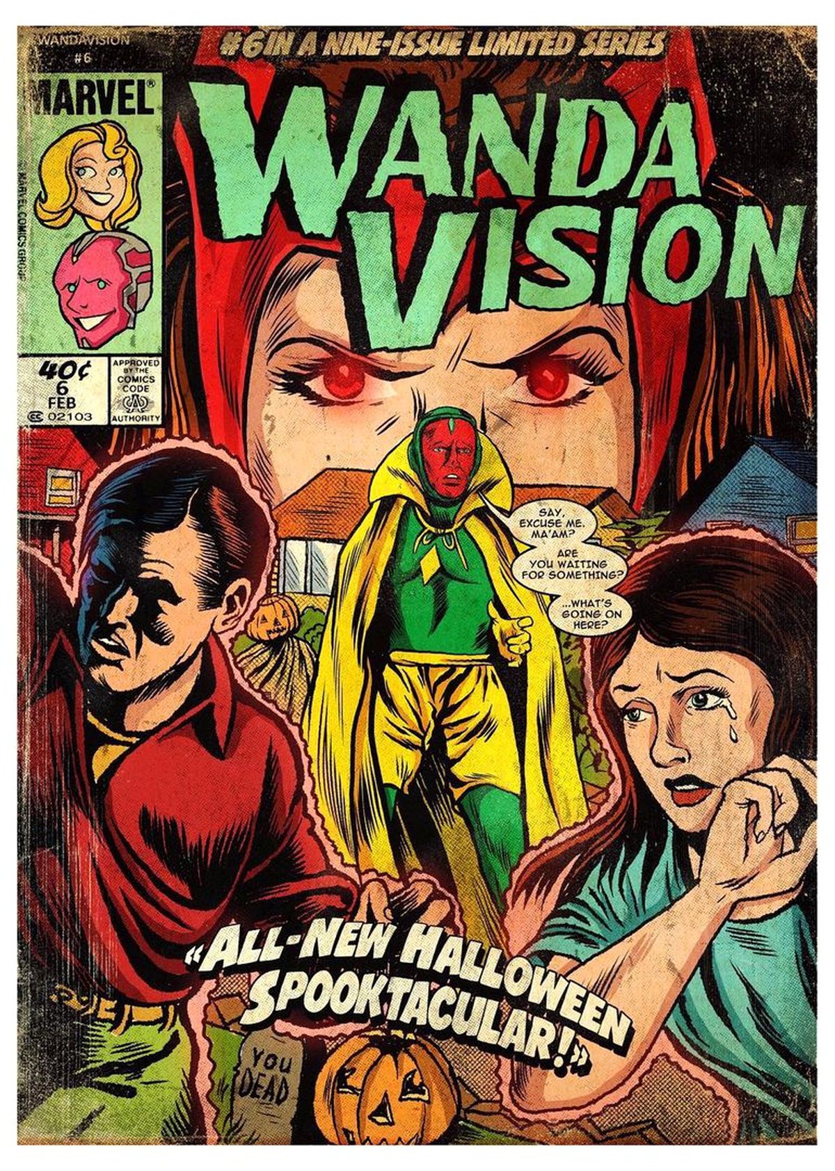 Для каждого из эпизодов шоу Вадим нарисовал комикс-обложку, воспроизводящую одну из сцен серии — или сразу несколько. Вот Ванда танцует с Виженом, вот находит необычно красный вертолет, вот — узнает, кто такая Агнес.