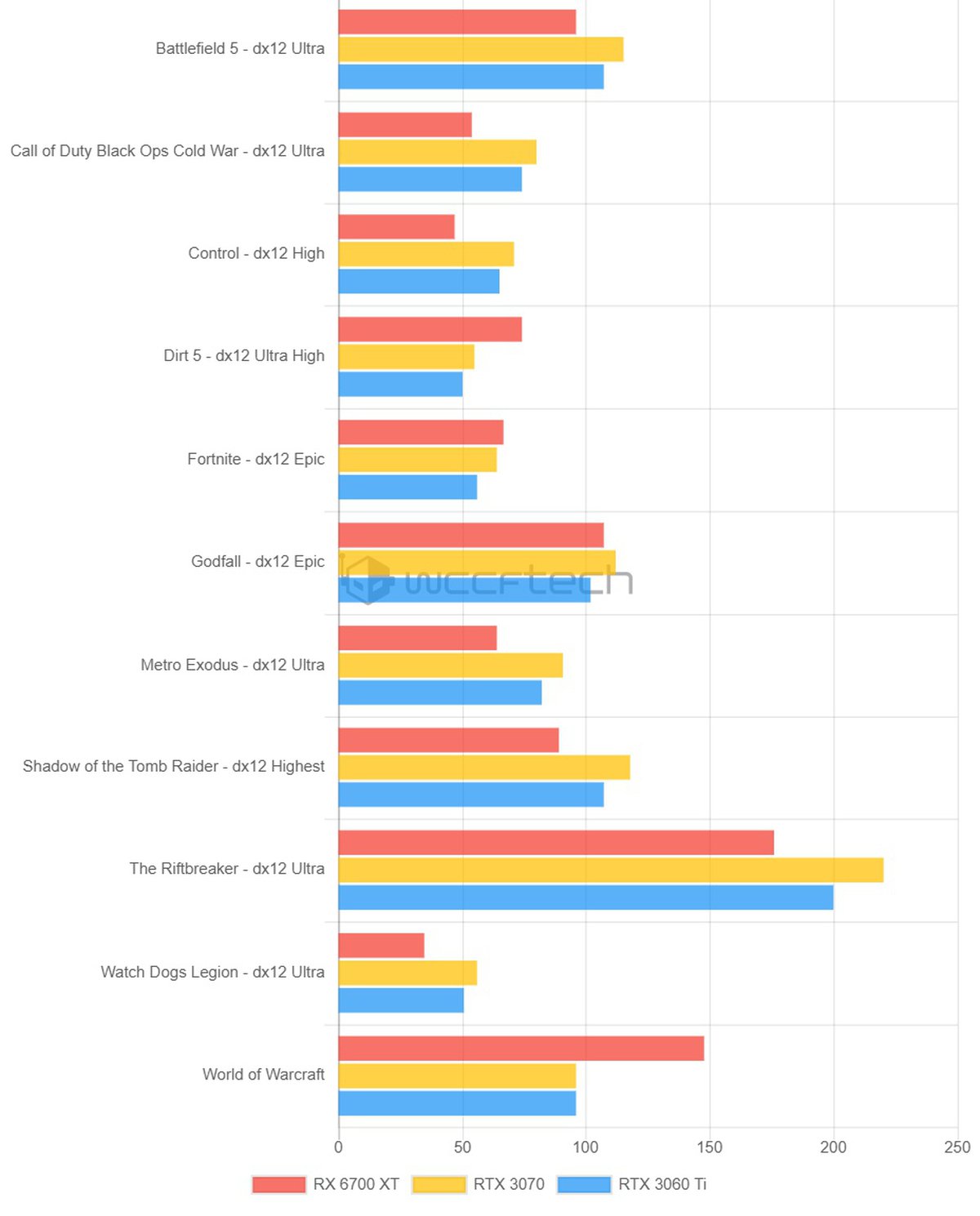 Судя по утекшим данным, без трассировки лучей Radeon RX 6700 XT показывает результаты на уровне GeForce RTX 3070: иногда карта немного медленнее, иногда заметно быстрее.