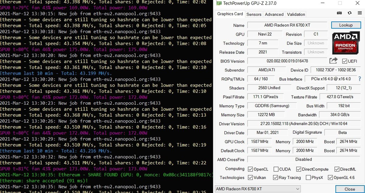 Для сравнения: на GeForce RTX 3060 Ti, прямом конкуренте Radeon RX 6700 XT в играх, можно получить порядка 50 мегахэшей в секунду. Однако, полагают в Cryptomining Blog, с помощью тюнинга хэшрейт Radeon RX 6700 XT можно поднять примерно до этого же уровня — где-то до 48 мегахэшей в секунду.