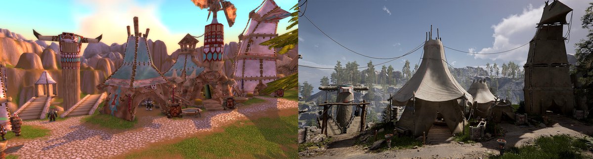 Модели основных объектов, похоже, создавались с нуля: по качеству проработки и детализации они значительно превосходят ассеты из World of Warcraft. Вот так локация Александра выглядит в сравнении с Громовым Утесом из игры.