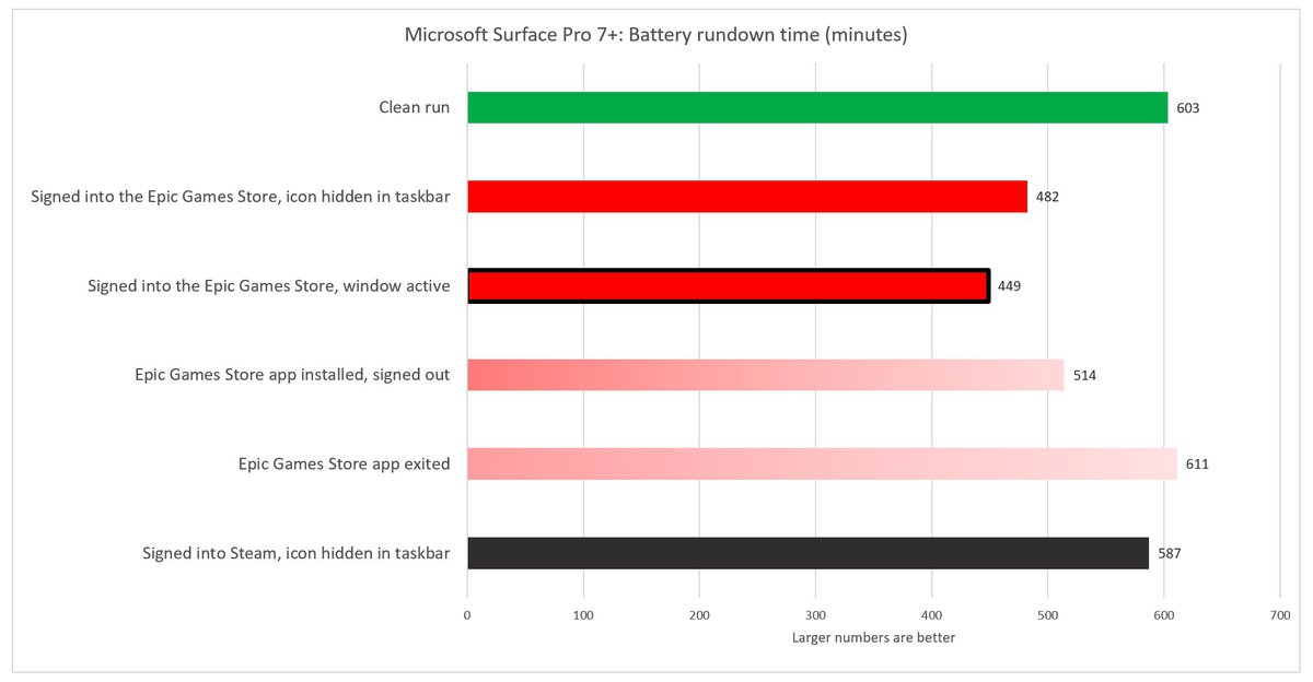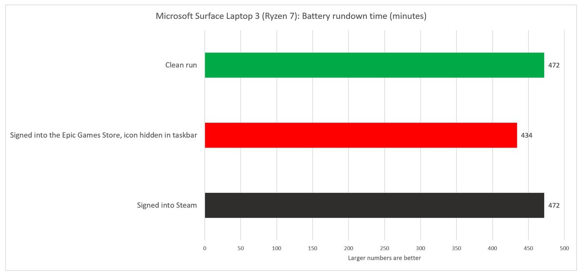 На ноутбуке Microsoft Surface Laptop 3 с процессором AMD Ryzen влияние лаунчера на время работы было скромнее. С установленным лаунчером Epic Games батарея разряжалась примерно на 8% быстрее.