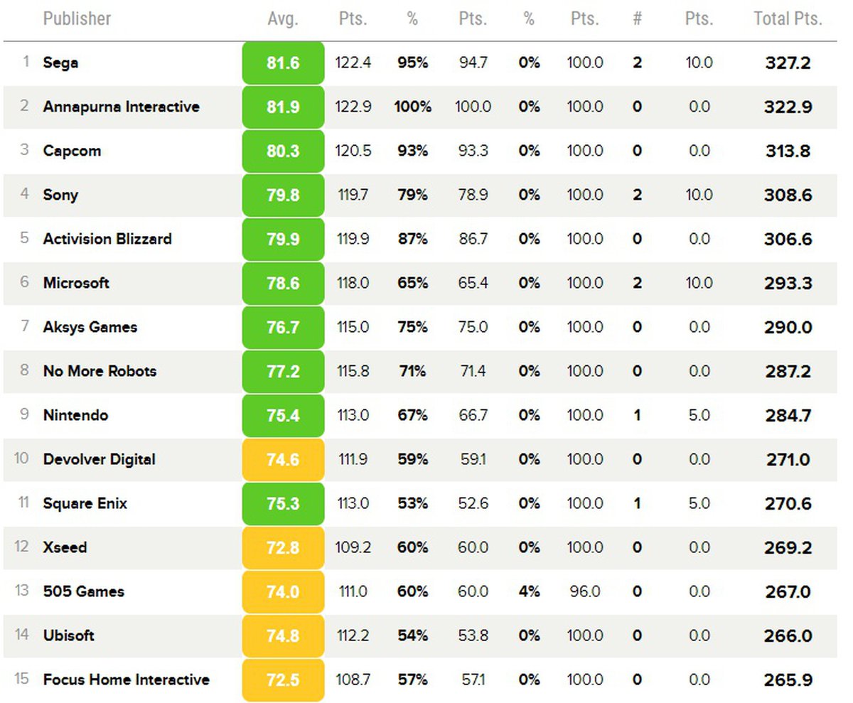 Ubisoft попала только на 14 место, у Electronic Arts и Take-Two Interactive — 21 и 22 строчки в чарте. Из крупных издателей ниже всего расположились Bandai Namco (38 место), Koei Tecmo (32 место), и THQ Nordic (27 место).