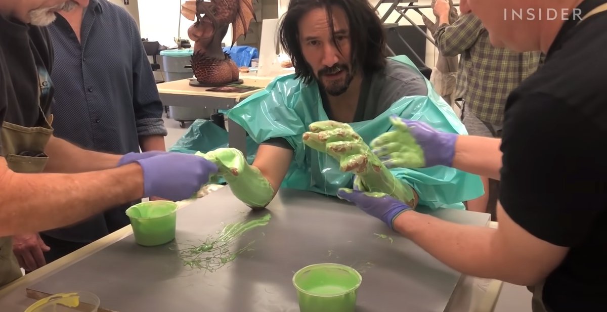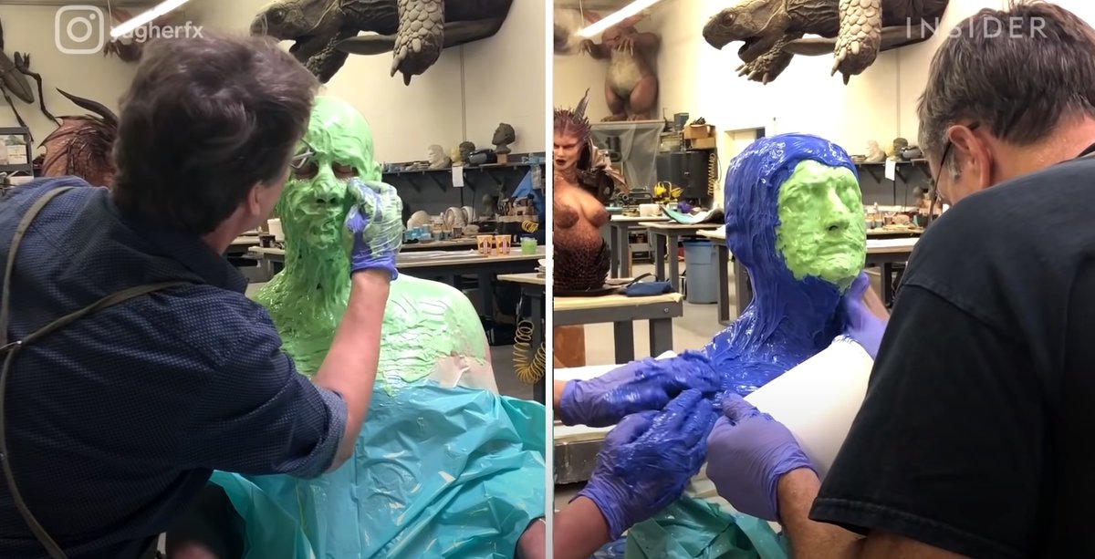 Для снятия слепков части тел актеров покрывают специальными силиконовыми составами. В состав зеленого силикона входит масло — специально для того, чтобы не устроить актерам незапланированную эпиляцию и оставить все волосы на своих местах.