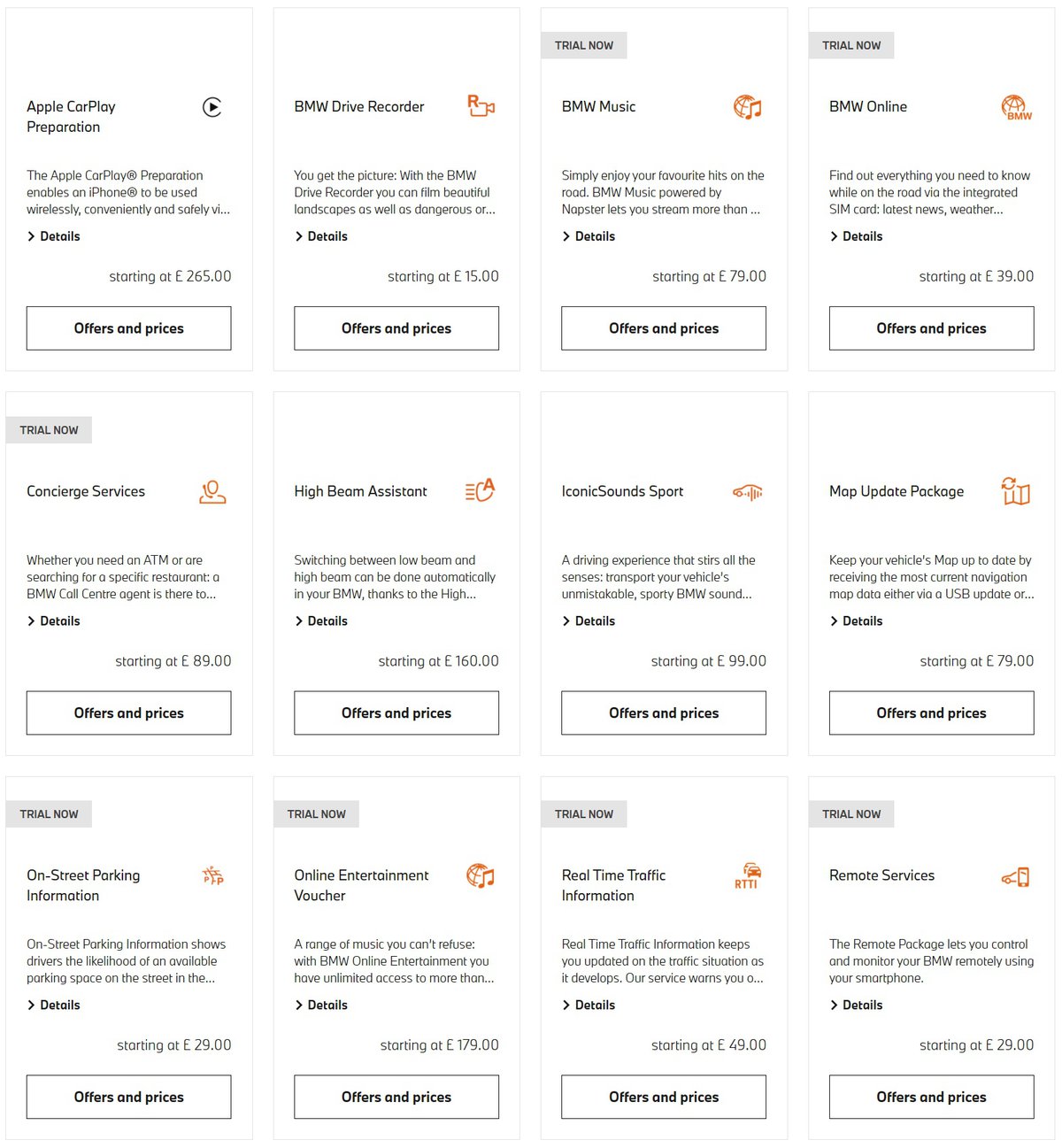 Судя по разделу на официальном сайте BMW, автомобили компании могут предложить владельца множество других платных услуг. Например, год доступа к информации о парковках обойдется в 29 фунтов, имитация спортивного выхлопа — соответствующие звуки издает аудиосистема машины — стоит 99 фунтов.