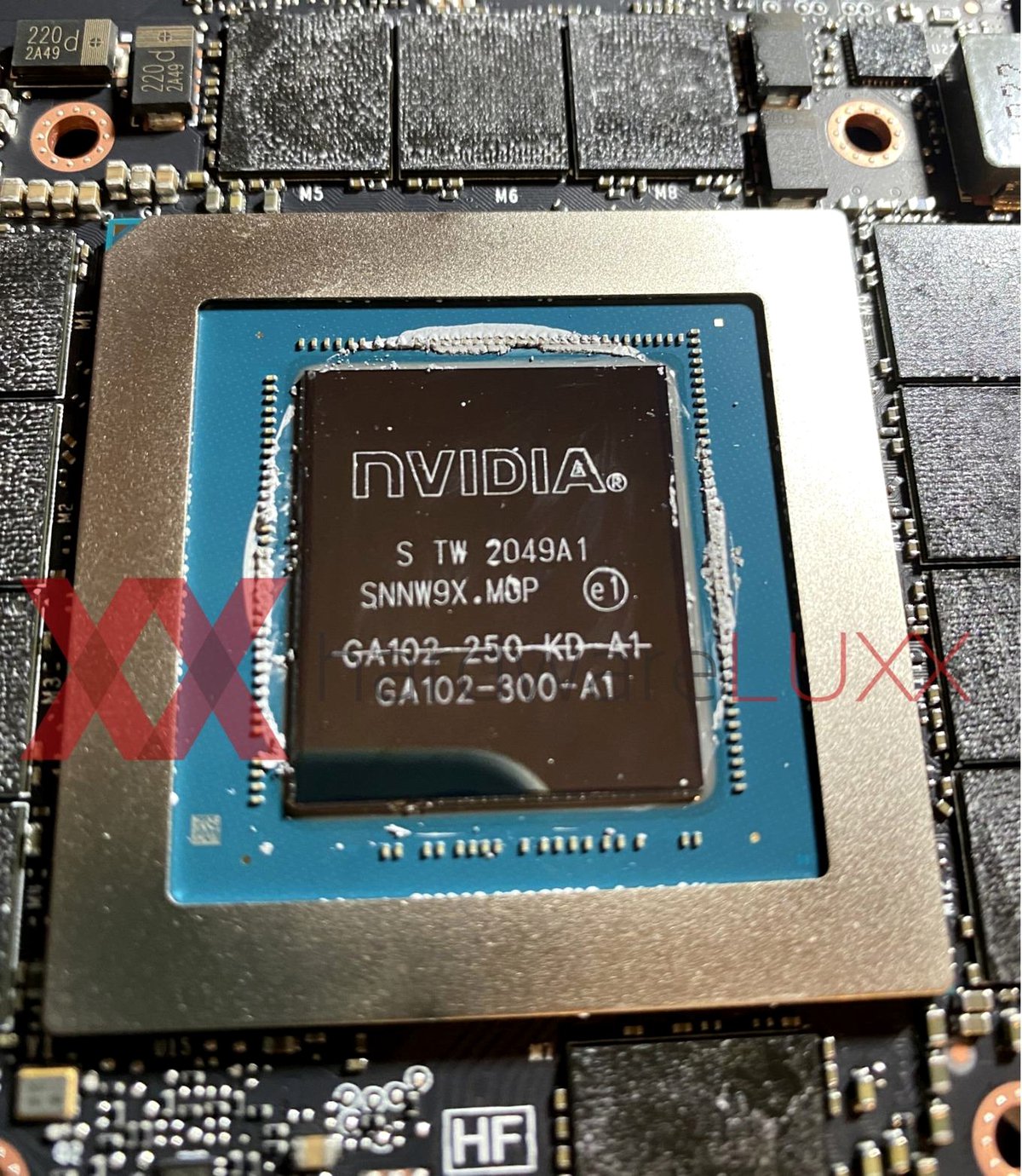 Один из читателей HardwareLuxx купил GeForce RTX 3090, снял систему охлаждения и обнаружил необычный чип. В стандартных RTX 3090 используется чип GA102-300, на чипе видеокарты читателя было две гравировки: GA102-250-KD и GA102-300.